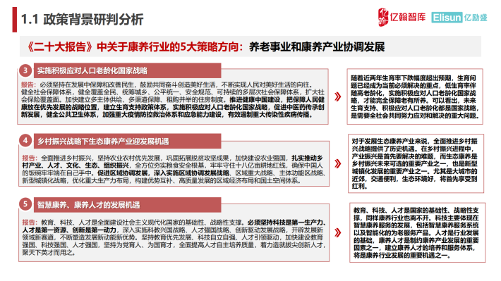 教育、科技、人才是国家的基础性、战略性支撑,同样康养行业也离不开。科技主要体现在智慧康养服务的发展,包括智慧康养服务系统以及智能化的为老服务产品。人才是行业发展的基础,康养人才是制约康养产业发展的重要因素之一,建立康养人才的培养和服务体系,将是康养行业发展的重要机遇之一。