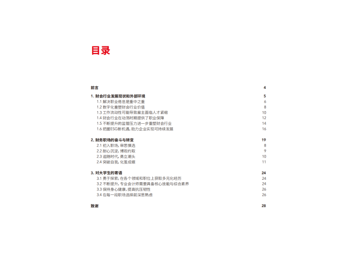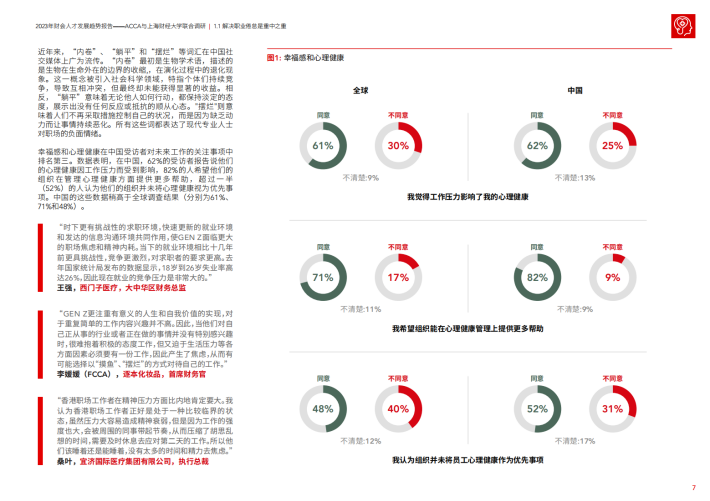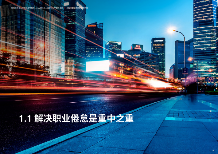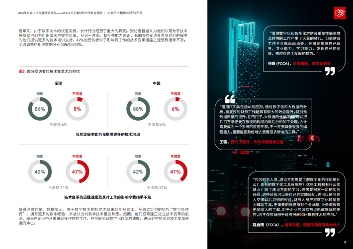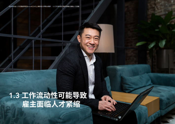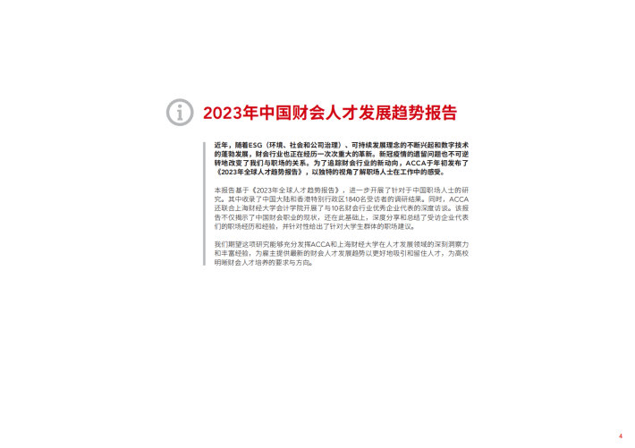 本报告基于《2023年全球人才趋势报告》,进一步开展了针对于中国职场人士的研究。其中收录了中国大陆和香港特别行政区1840名受访者的调研结果。同时,ACCA还联合上海财经大学会计学院开展了与10名财会行业优秀企业代表的深度访谈。该报告不仅揭示了中国财会职业的现状,还在此基础上,深度分享和总结了受访企业代表们的职场经历和经验,并针对性给出了针对大学生群体的职场建议。