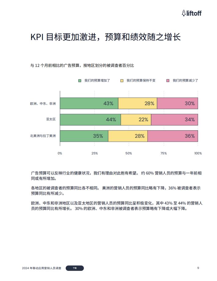 各地区超过80%的移动应用营销人员预计明年的广告支出将有所增加,并优先将广告支出分配到SAN和ad Network。