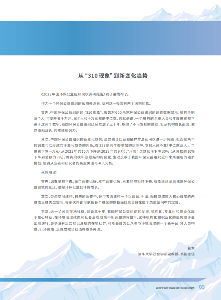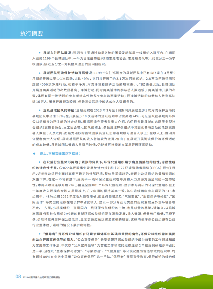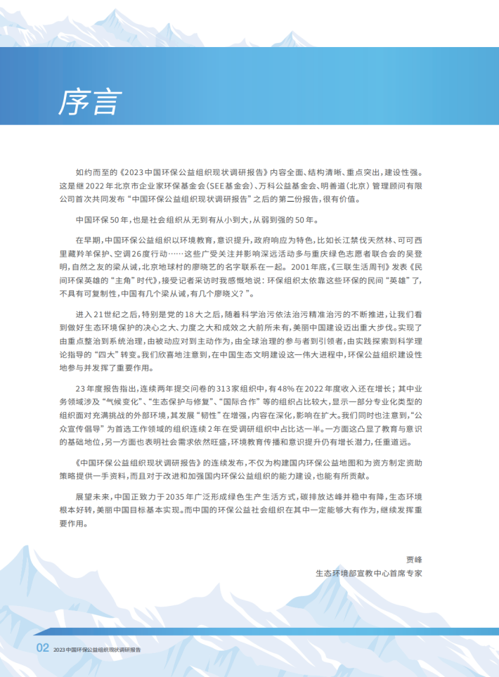 如约而至的《2023中国环保公益组织现状调研报告》内容全面、结构清晰、重点突出,建设性强。这是继2022年北京市企业家环保基金会(SEE基金会)、万科公益基金会、明善道(北京)管理顾问有限公司首次共同发布“中国环保公益组织现状调研报告”之后的第二份报告,很有价值。