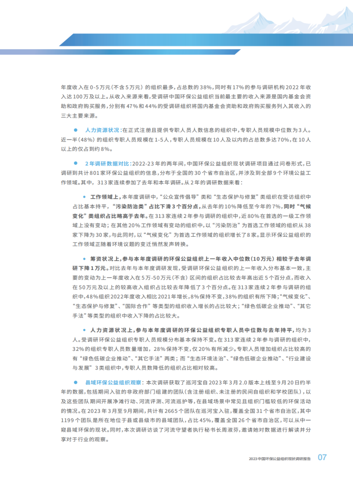 23年度报告指出,连续两年提交问卷的313家组织中,有48%在2022年度收入还在增长;其中业务领域涉及“气候变化”、“生态保护与修复”、“国际合作”等的组织占比较大,显示一部分专业化类型的组织面对充满挑战的外部环境,其发展“韧性”在增强,内容在深化,影响在扩大。我们同时也注意到,“公众宣传倡导”为首选工作领域的组织连续2年在受调研组织中占比达一半。一方面这凸显了教育与意识的基础地位,另一方面也表明社会需求依然旺盛,环境教育传播和意识提升仍有增长潜力,任重道远。