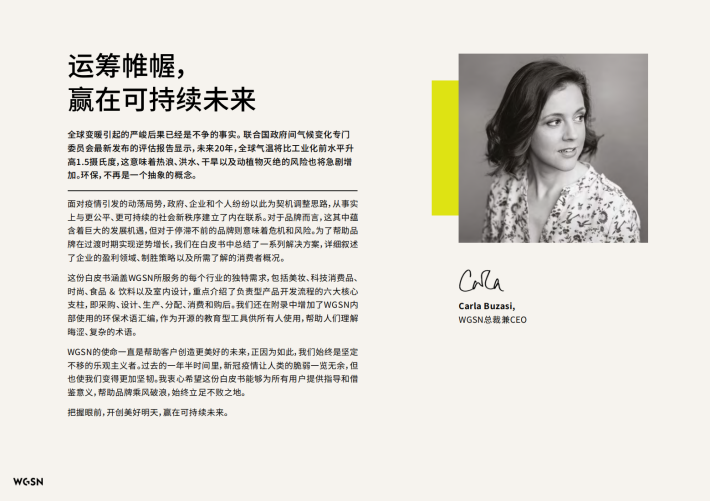 WGSN的使命一直是帮助客户创造更美好的未来,正因为如此,我们始终是坚定不移的乐观主义者。过去的一年半时间里,新冠疫情让人类的脆弱一览无余,但也使我们变得更加坚韧。我衷心希望这份白皮书能够为所有用户提供指导和借鉴意义,帮助品牌乘风破浪,始终立足不败之地。
