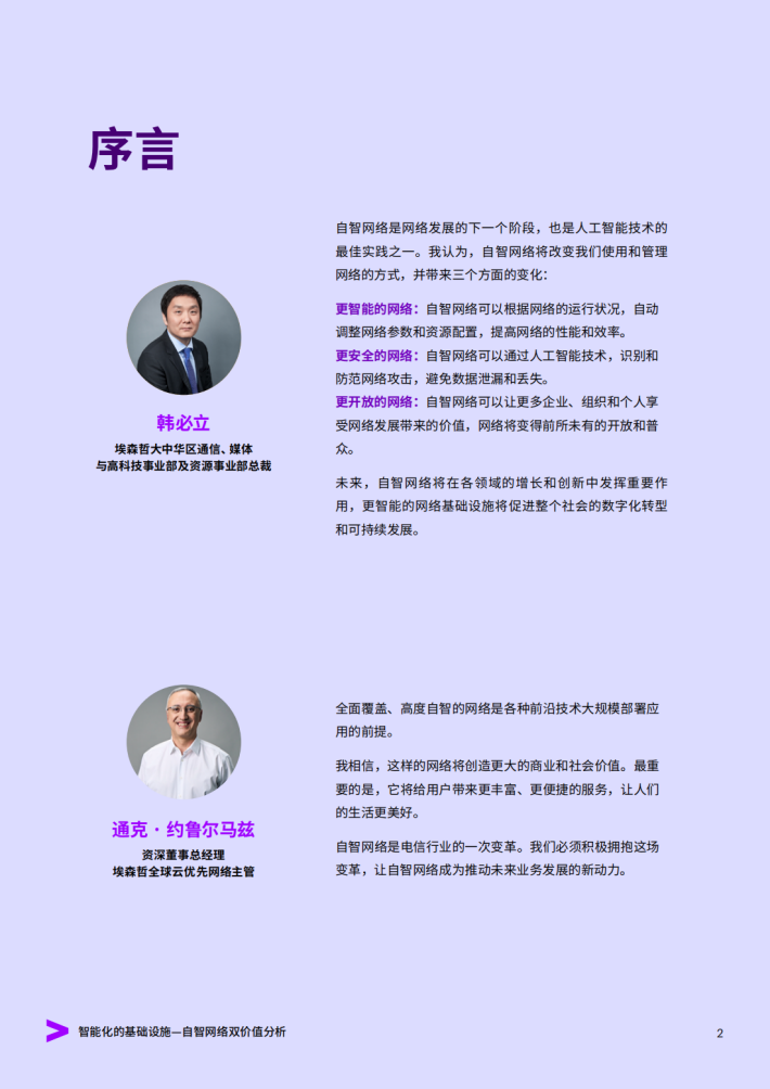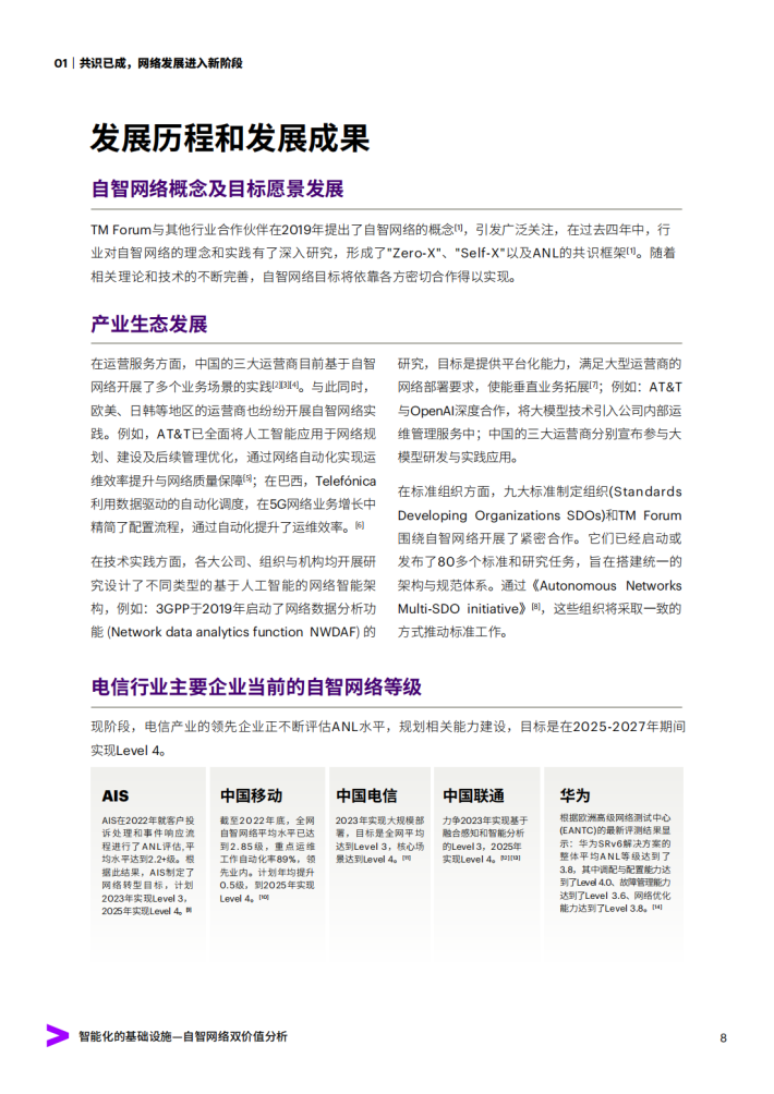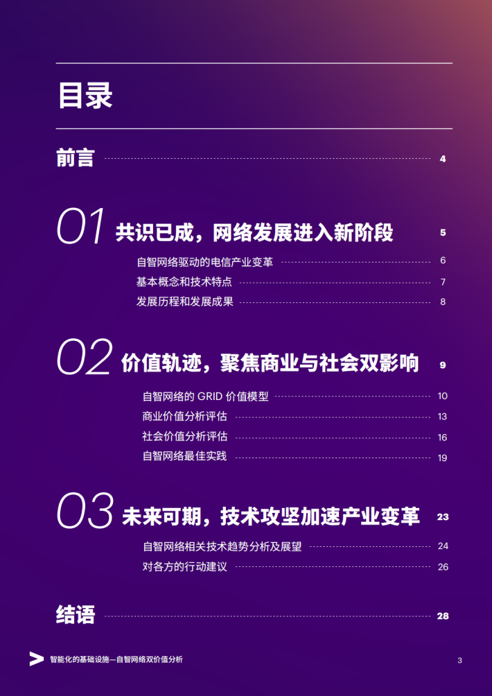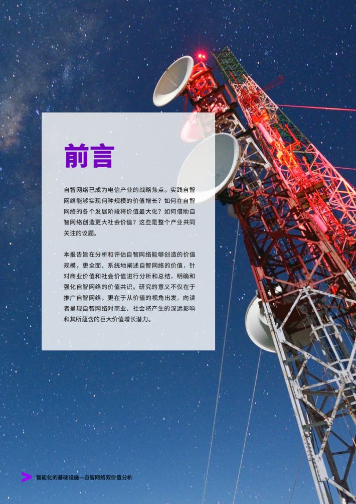 本报告旨在分析和评估自智网络能够创造的价值规模,更全面、系统地阐述自智网络的价值,针对商业价值和社会价值进行分析和总结,明确和强化自智网络的价值共识。研究的意义不仅在于推广自智网络,更在于从价值的视角出发,向读者呈现自智网络对商业、社会将产生的深远影响和其所蕴含的巨大价值增长潜力。