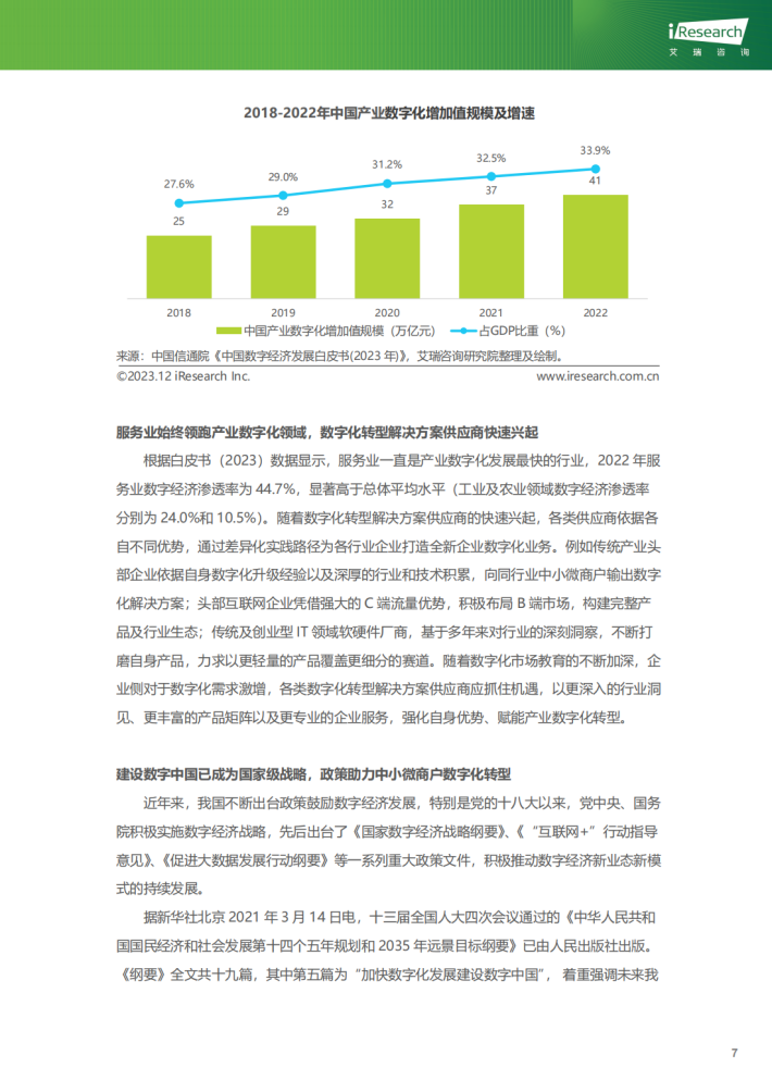 在延续以往研究的基础上,《中国数字经济发展研究报告(2020年)》首次将数字经济组成部分扩展为“四化”——即数字经济包含数字产业化、产业数字化、数据价值化及数字化治理。其中产业数字化是数字经济发展的主阵地,是指传统产业应用数字经济所带来的生产数量和效率的提升。2022年我国产业数字化增加值达到41万亿元,占GDP比重达到33.9%,其增速远高于同期GDP增速。各类传统产业跟随互联网热潮,利用数字技术进行多角度、全链条的全面改造提升,并逐步形成由单点改造向产业集群协同升级的趋势。