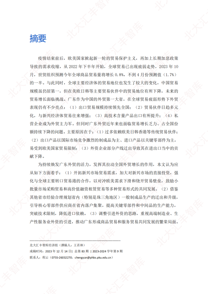 为持续焕发广东外贸的活力,发挥其拉动全国外贸增长的作用,本文认为应从如下方面着手: (1)开拓新兴市场贸易需求,加大对新兴市场的直接投资,强化与全球主要转口贸易港的合作,以对冲欧美需求下滑和绕开贸易壁垒,鼓励小批量市场采购贸易和高价值融资租赁贸易等多种贸易形式的共同发展。 (2)借鉴其他省市经验合理规划省内(特别是珠三角地区)一般制成品生产的迁出和升级,引导核心零部件供应商在省内落户集聚,提高关键零部件和中间品的生产能力,突破技术限制,降低进口依赖。(3)调整引进外资的思路,重视高端制造业、生产性服务业外资的引进,推动广东形成商品贸易和服务贸易共同发展的繁荣局面。