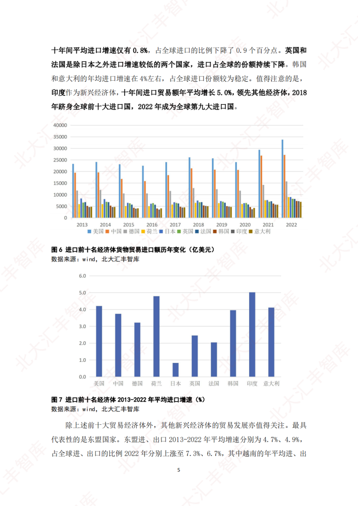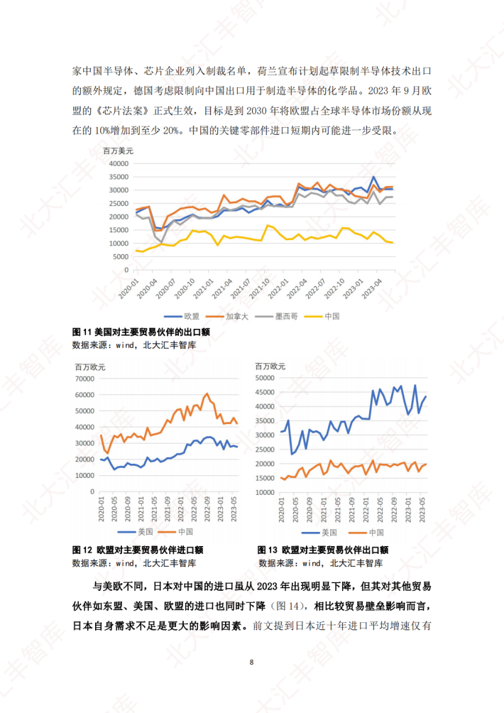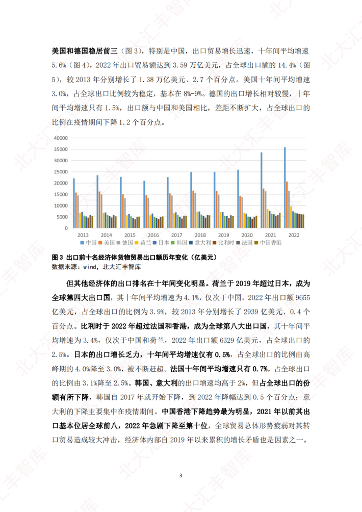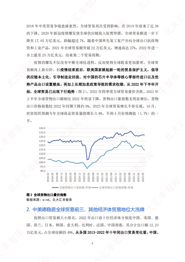 疫情结束前后,欧美国家掀起新一轮的贸易保护主义,再加上长期加息政策导致的需求收缩,从2022年下半年开始,全球贸易已出现疲弱走势,2023年10月,世贸组织预测今年全球商品贸易量将增长0.8%,不到4月份预测值(1.7%)的一半。与此同时,全球主要经济体的贸易地位也发生了较大的变化,中国贸易