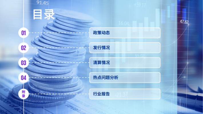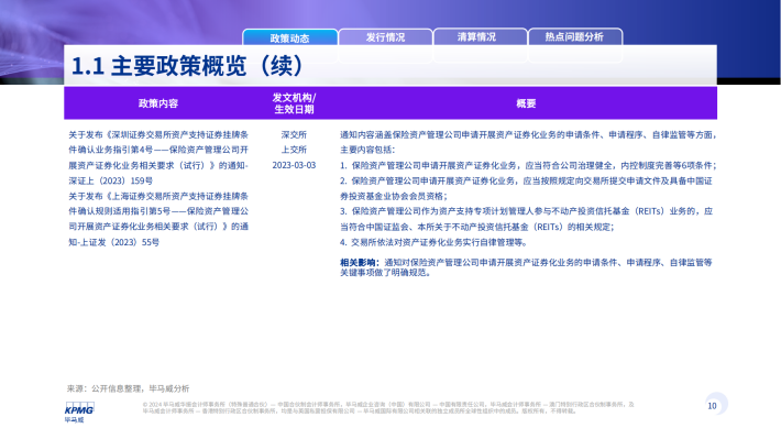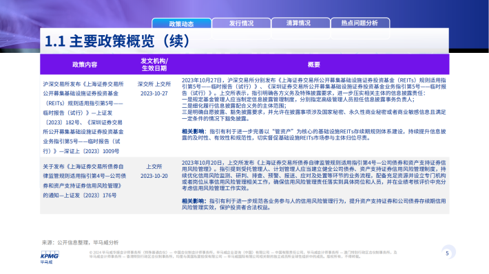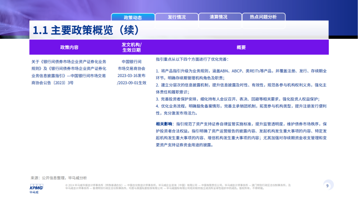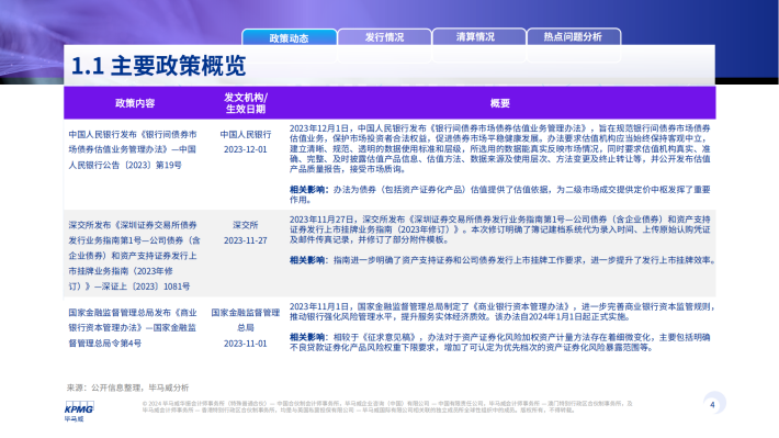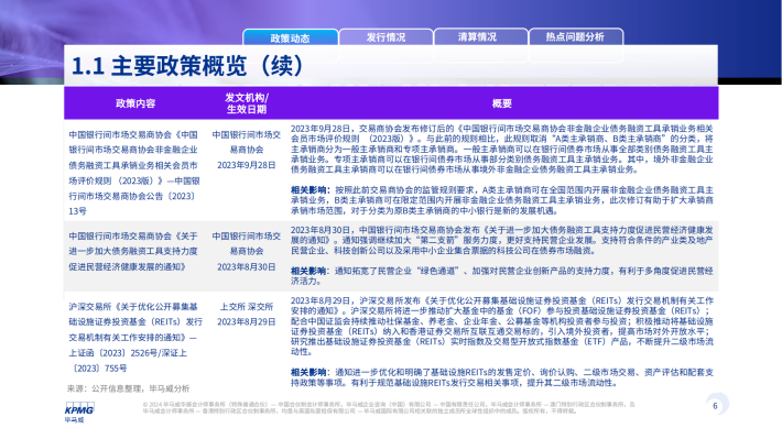 2023年信贷ABS发行数量为199单,发行规模为人民币3,466亿元,发行数量同比上涨32个百分点,但发行金额下跌1%。企业ABS发行数量为1,265单,发行规模为人民币11,794亿元,为四个市场类型中金额和数量规模最大,发行数量和发行规模同比均有不同程度的小幅上升。ABN新发产品342单,发行规模为人民币3,232亿元,同2022年相比数量下降13%,发行规模下降31%。公募REITS类在2023年共新发产品10单,发行规模人民币252亿元,发行数量和规模较去年均有不同程度的降低。