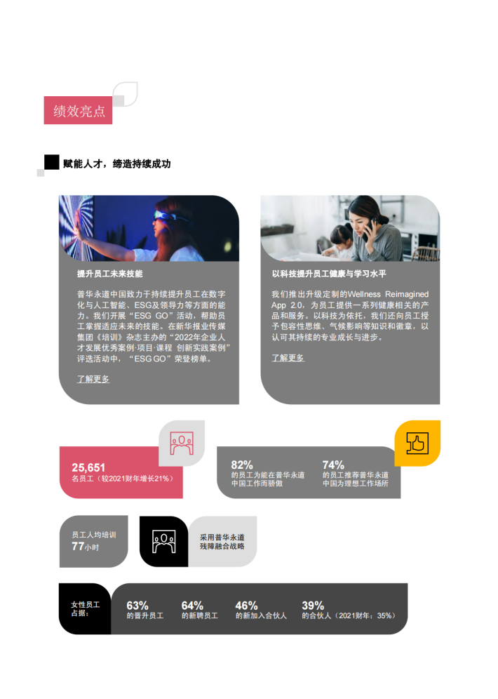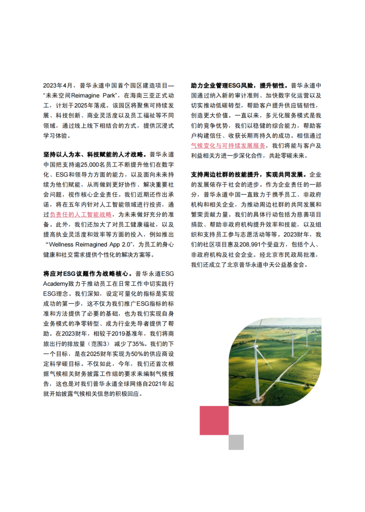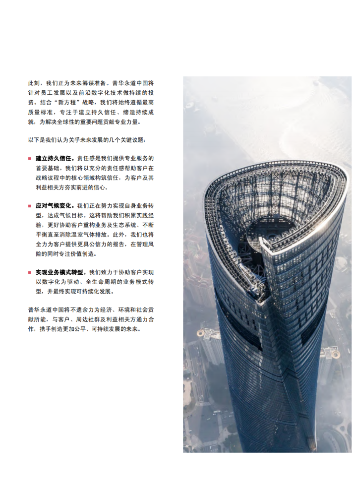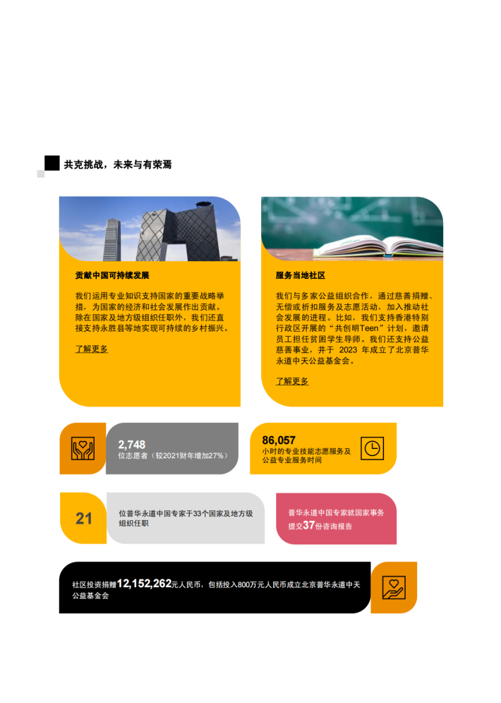 自我们发布上一份报告以来,很多全球性的挑战日趋复杂,例如紧张的地缘政治局势,气候变化导致的极端天气事件,以及公众对企业改善问责制和价值观的持续期待等。由此带来的经济和社会影响,也在过去几年间给我们带来了新的考验。在这样的背景下,我们充分发挥普华永道全球网络的力量,以坚持不懈、灵活应对的态度正视挑战,秉承“解决重要问题,营造社会诚信”的企业使命,努力确保所有行为皆遵循我们的五大核心价值观—诚信、增值、关怀、合作和创新。