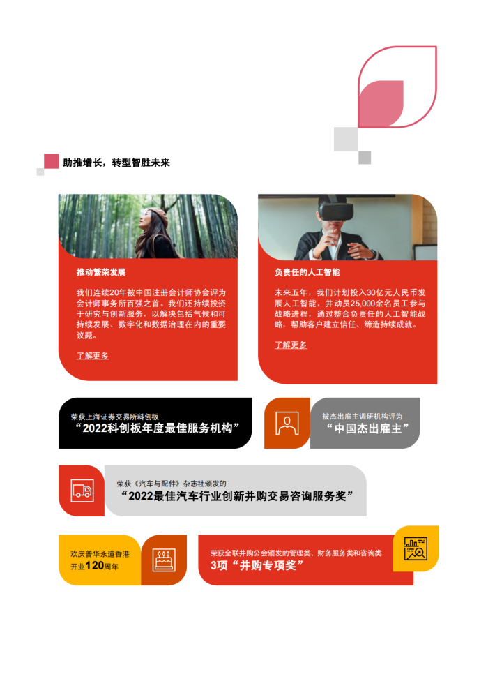 中国正朝着低碳和技术驱动型经济的方向转型,以实现更高质量的增长。通过不断完善政策、发展新兴绿色和高科技产业,以及投资先进基础设施和服务业来推动可持续发展,同时为国家、区域和世界创造了更多机遇。普华永道中国会继续全力以赴推动国家经济的高质量发展,助力中国式现代化建设。