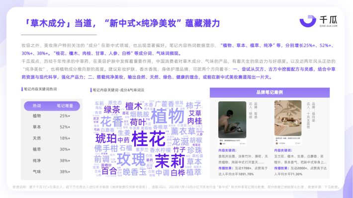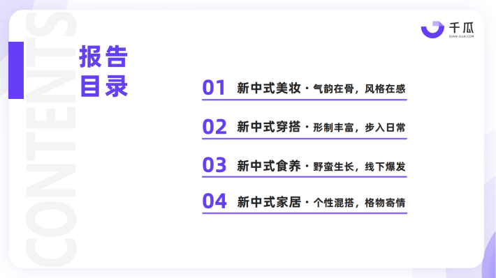 本期报告,千瓜将进一步调研“新中式”大势下,美妆、服饰、食品保健品、家居家装,四大热门赛道细分趋势,发掘解析市场与内容风向,望能为品牌未来营销带来启示。