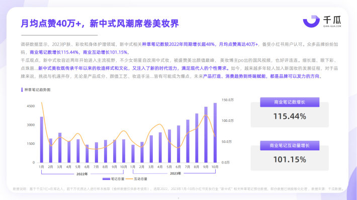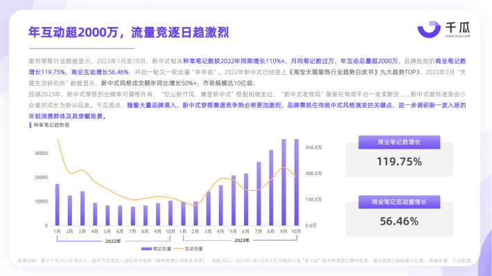 千瓜数据显示,2023年小红书平台“新中式”相关笔记声量增长390%+,互动总量增长188%+,热度高涨。符合当下年轻消费取向的“新中式”,在小红书走向普适化、现象化、商业化,品牌价值日益凸显。