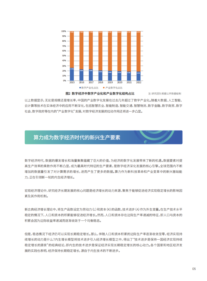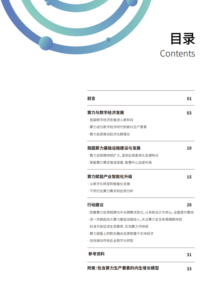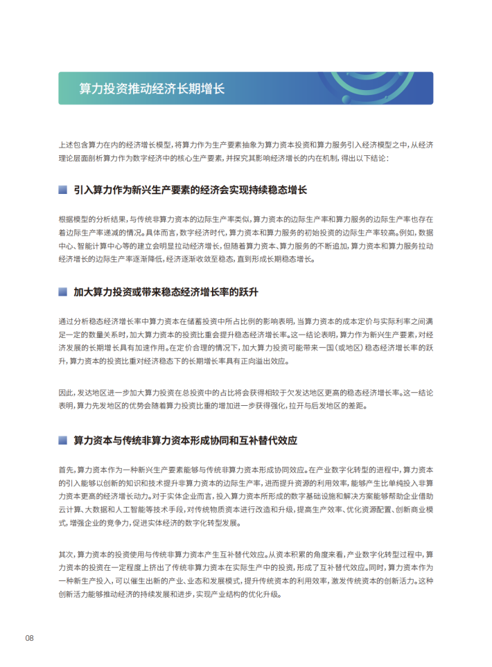 本报告聚焦于算力作为推动数字经济发展的关键引擎和支撑动力这一议题,首先,构建起包含了算力投资与算力服务的内生增长模型,分析了算力在数字经济时代作为新兴生产要素推动经济增长的基本原理与作用机制;其次,报告从分析算力如何推动各产业数字化转型升级视角,分析了算力在推动互联网、金融、制造、医疗、电信、能源、交通等企业重塑竞争优势,以实现可持续增长方面发挥的积极作用,并列举了各领域代表企业基于算力基础设施,推动自身数字化、智能化建设的典型案例;再次,报告从算力供需平衡、算力全生命周期碳排放、算力标准与生态建设、企业智能化变革等方面,提出未来算力高质量发展行动建议,为我国政府制定政策及企业数智化转型提供参考,推动算力产业和经济社会实现高质量发展。