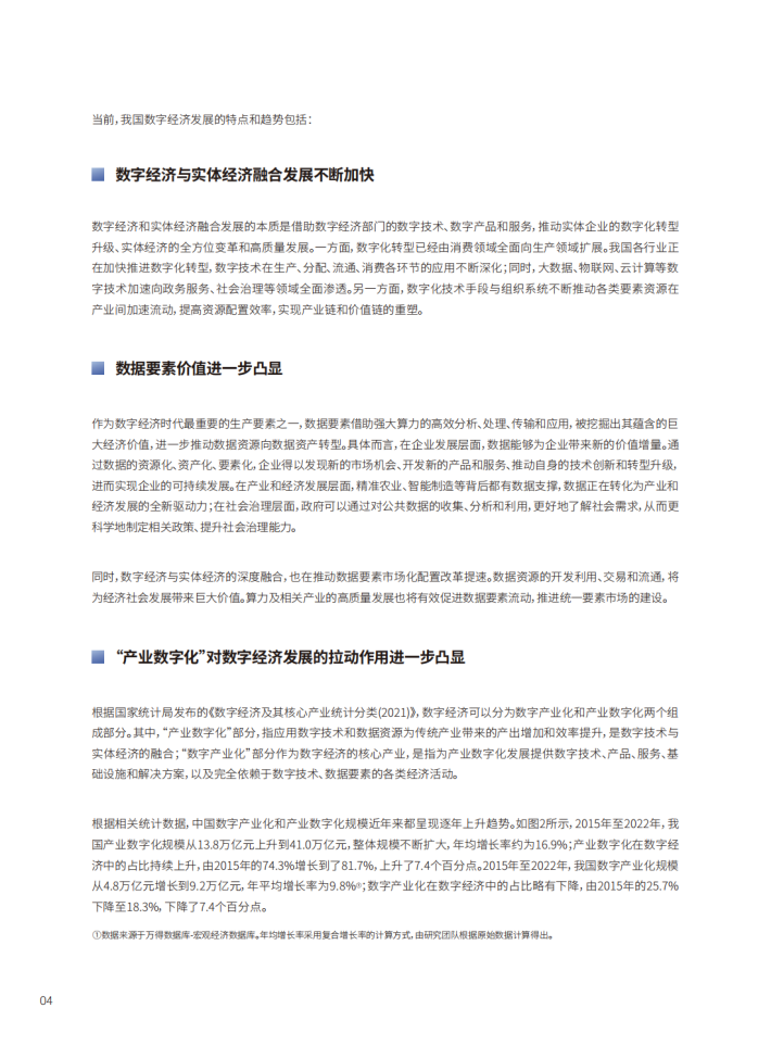当前,数字经济作为一种新的经济形态,已经成为中国经济高质量发展的重要动力。相关统计数据显示,2022年中国数字经济规模达到50.2万亿元,总量稳居世界第二,占GDP比重达到41.5%。数字经济的崛起和繁荣,赋予了经济社会发展的新领域和新动能。数字经济产业范围包含数字产业化和产业数字化两部分,其中数字产业化涉及到计算机制造、软件开发、信息技术服务、信息技术设施建设、数据资源与产权交易等产业门类,是数字经济发展的重要动力之一;产业数字化涉及到制造业、农业、交通业等传统产业的数字化转型升级,体现了数字技术与实体经济的融合。