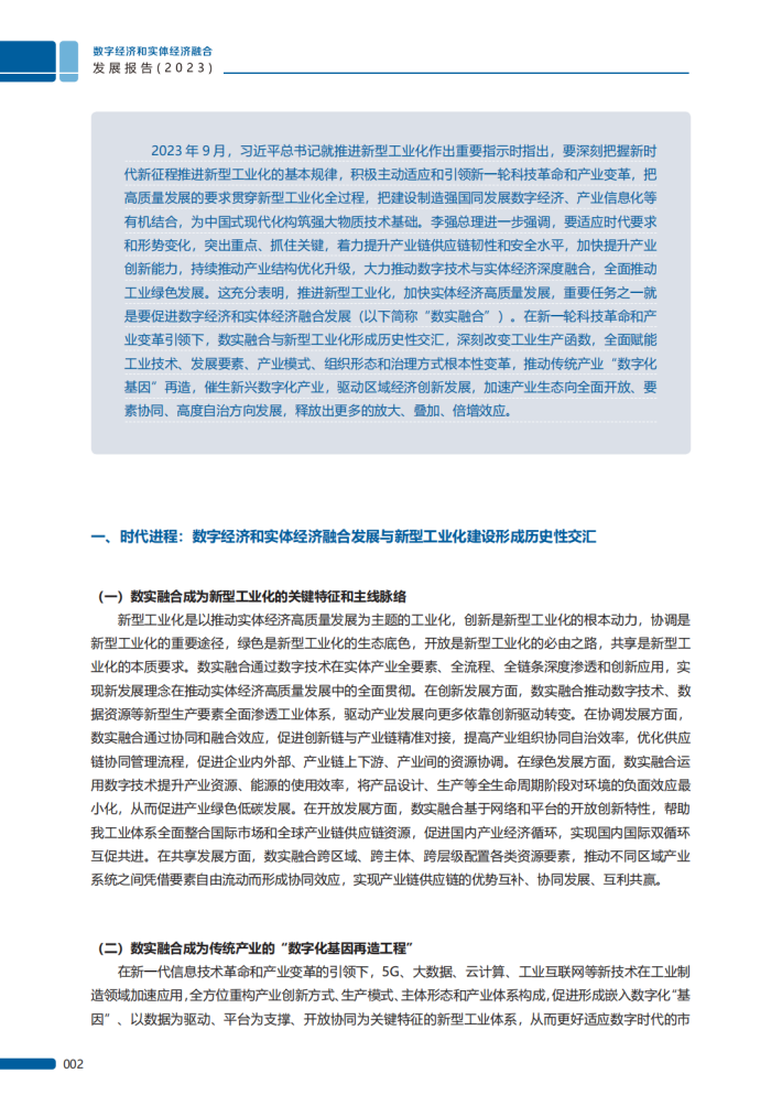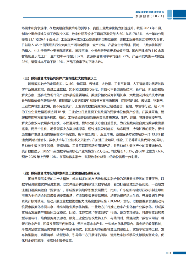在新一轮科技革命和产业变革的时代潮流下,推进新型工业化与数字经济和实体经济融合发展(以下简称“数实融合”)形成历史性交汇,数实融合成为新型工业化的关键特征和主线脉络,为产业数字化和数字产业化开拓了新空间,成为区域探索新型工业化路径的战略支点。随着数实融合不断深化,数字化赋能新型工业化也向纵深发展并取得积极成效。一方面,各行业数字化转型进入全面加速期,高水平、多层次、个性化转型实践持续涌现;另一方面,数字科技企业充分发挥技术创新力和集成服务能力,为赋能各行业数字化转型、加快实现新型工业化发展提供了关键支撑。