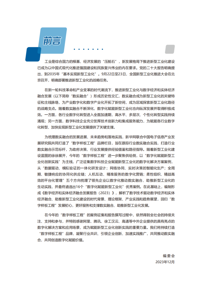 为梳理数实融合的发展进展、未来趋势和落地实践,新华网联合中国电子信息产业发展研究院共同打造了“数字样板工程”品牌栏目,旨在跟踪行业数实融合实践,打造行业数实融合示范标杆,为政府决策、行业发展提供经验借鉴和路径指导。随着新型工业化建设蓝图的徐徐展开,今年的“数字样板工程”进一步聚焦供给侧,以“数字化赋能新型工业化创新实践”为主线,广泛征集数字科技企业赋能新型工业化的数字化解决方案案例,从“数据驱动、模拟验证的一体化研发设计;网络协同、实时决策的智能化生产;全周期、敏捷响应的协同化供应链;人机互动、精准服务的数字化营销;柔性组织、精益高效的平台化管理”五个方向梳理了领先企业以数字化推动数实融合、助推新型工业化的生动实践,并最终遴选出16个“数字化赋能新型工业化”优秀案例。在此基础上,编制形成《数字经济和实体经济融合发展报告(2023)》,解析了数字技术驱动数字经济和实体经济融合、助推新型工业化建设的时代背景、理论框架、产业实践和趋势展望,回归“数字样板工程”发展初心,更好服务和支撑数实融合、助推新型工业化发展。