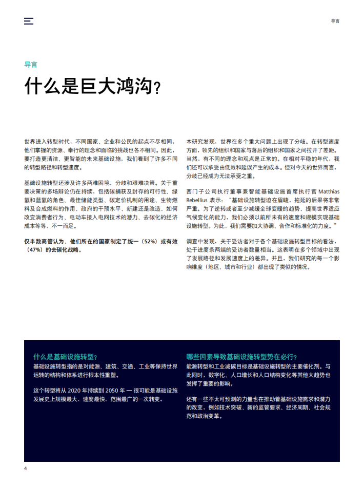 西门子全球基础设施转型调查报告旨在探讨基础设施转型的现状、当务之急以及未来的道路。企业和政府的领导者必须共同努力,以负责任的态度推动世界基础设施发展。