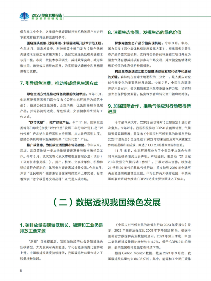 可再生能源装机量创历史新高,并超越煤电成为我国“第一大电源”;新能源汽车、光伏和锂电池成为出口新三样,成为拉动经济增长的绿色新动能;碳市场扩容加快,全国CCER市场实现重启;碳足迹管理体系整体框架确立,绿色消费理念日益普及。