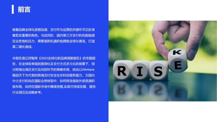 本报告是亿邦智库《2023全球化新品牌洞察报告》的专题报告,在全球收单规则差异化及支付方式多元化的背景下,探讨跨境出海在支付及风控环节的策略布局,结合以Wintranx稳迎天下为代表的跨境支付安全生态科技服务能力,为国内中小支付机构在国际业务转型中,如何有效借助外部资源积极布局、如何在国际市场中精准突围,实现可持续发展,提供行业洞见及战略参考。
