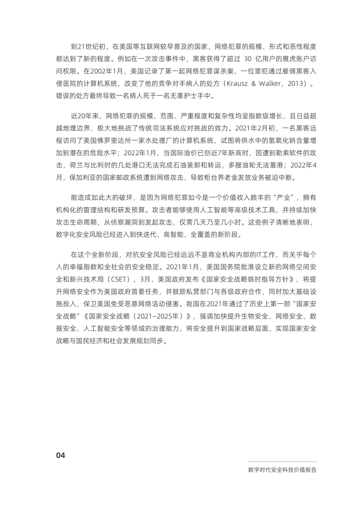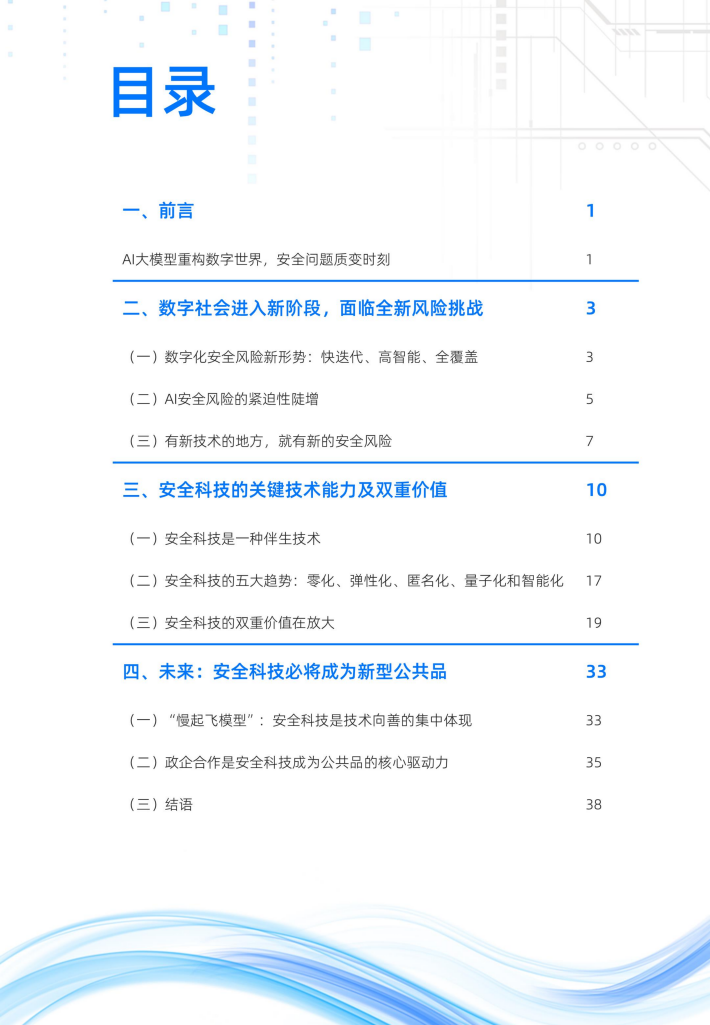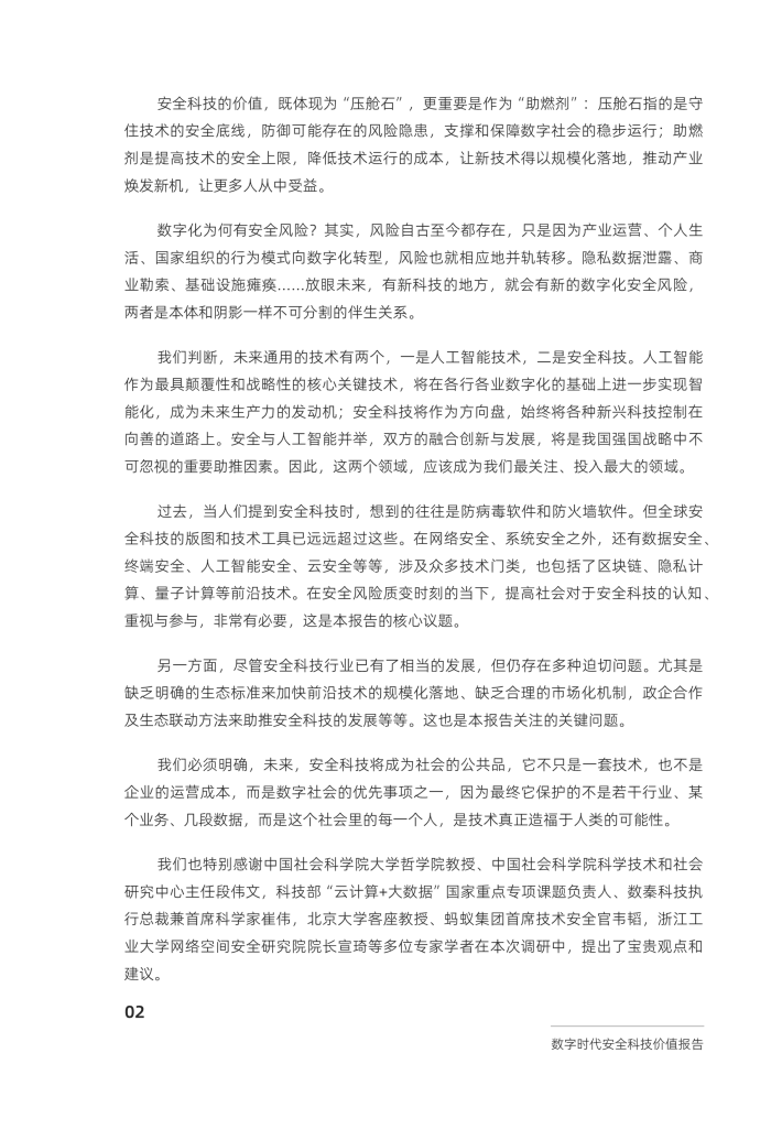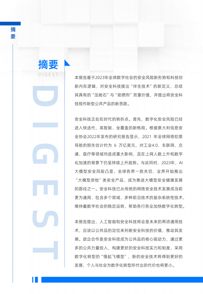 本报告基于2023年全球数字社会的安全风险新形势和科技创新内在逻辑,对安全科技提出“伴生技术”的新定义,总结其具有的“压舱石”与“助燃剂”双重价值,并提出将安全科技视作新型公共产品的新思路。