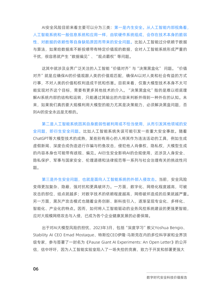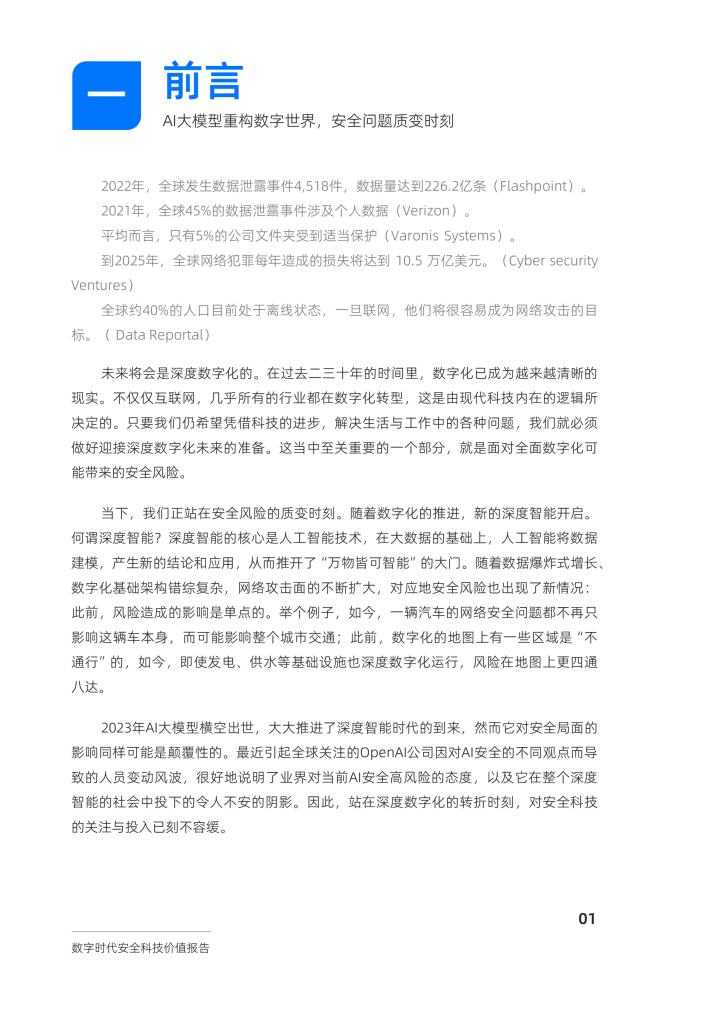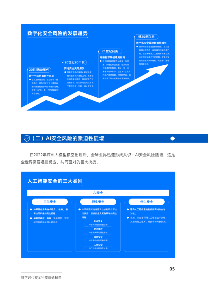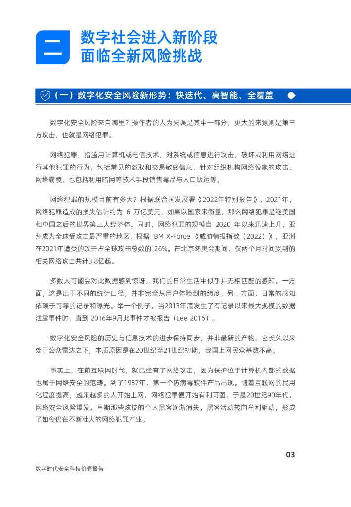 安全科技正处在时代的转折点。首先,数字化安全风险已经进入快迭代、高智能、全覆盖的新格局。根据意大利信息安全协会2022年发布的研究报告显示,2021年全球网络犯罪导致的损失估计约为6万亿美元,对工业4.0、车联网、交通、医疗等领域均造成重大影响,且在上网人数上升和数字化加速的背景下仍呈持续上升趋势。与此同时,2023年,Al大模型安全风险凸显,全球各界一致关切,业界开始推出“大模型质检”类安全产品,成为推进大模型安全健康发展的路径之一。安全科技已从传统的网络安全技术发展成当前更为通用、包含多个领域、多种前沿技术的复杂系统性技术,维持着数字社会的稳定运转,帮助各行各业加快数字化转型。