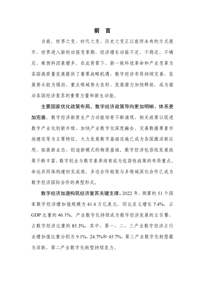 当前,世界之变、时代之变、历史之变正以前所未有的方式展开,世界进入新的动荡变革期,经济增长动能不足,不稳定、不确定、难预料因素增多。在此背景下,新一轮科技革命和产业变革为各国高质量发展提供了重要战略机遇,数字经济布局持续完善,发展势头较为强劲、重点领域势头良好、发展潜力加快释放,成为推动各国经济复苏的重要力量和新生动能。