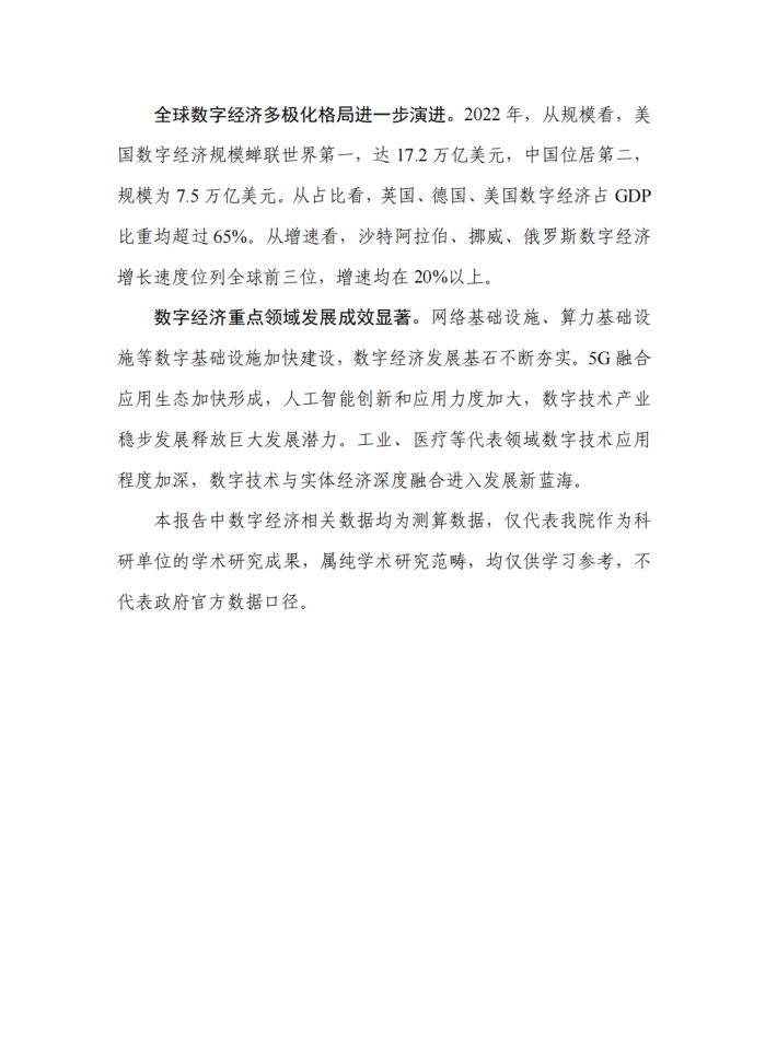 全球数字经济多极化格局进一步演进。2022年,从规模看,美国数字经济规模蝉联世界第一,达17.2万亿美元,中国位居第二,规模为7.5万亿美元。从占比看,英国、德国、美国数字经济占GDP比重均超过65%。从增速看,沙特阿拉伯、挪威、俄罗斯数字经济增长速度位列全球前三位,增速均在20%以上。