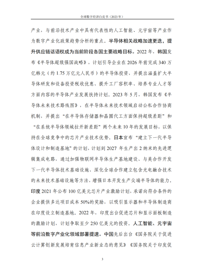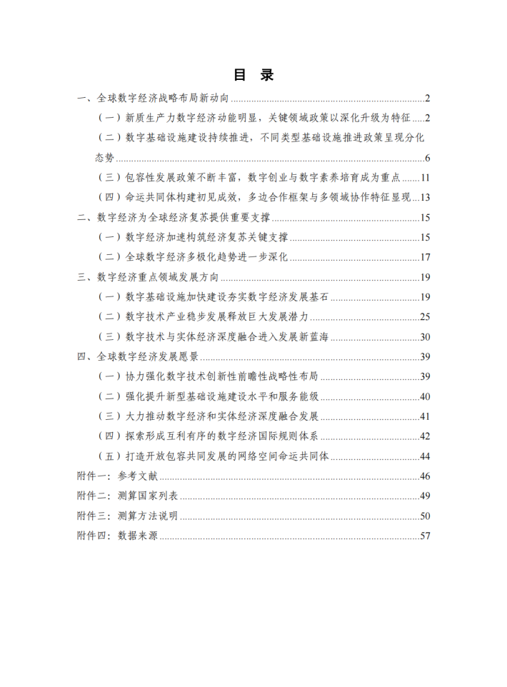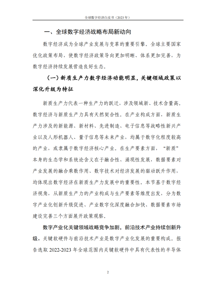 主要国家优化政策布局,数字经济政策导向更加明晰、体系更加完善。数字经济新质生产力动能培育不断涌现,相关政策以促进数字产业化创新升级、加快产业数字化深度融合、完善数据要素市场建设等为主要特征。大力发展数字基础设施已成为各国激活新应用、拓展新业态、创造新模式的物质基础。数字经济包容性发展政策不断丰富,数字创业与数字素养培育成为包容性政策的布局重点。命运共同体构建初见成效,多边合作框架与多领域深化合作已成为数字经济国际合作的典型形式。