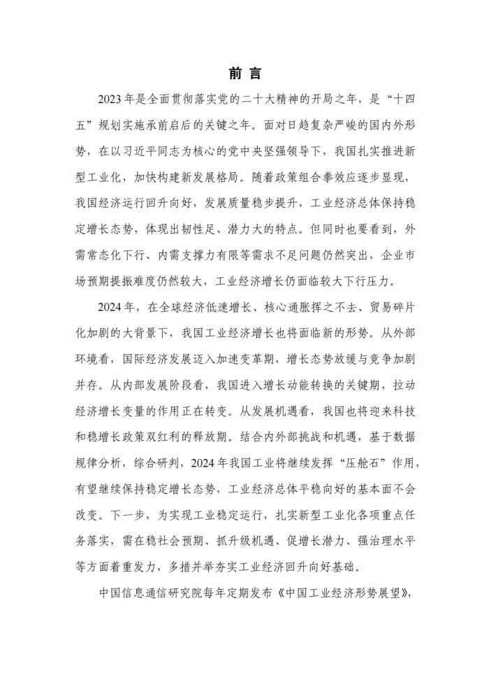 2024年,在全球经济低速增长、核心通胀挥之不去、贸易碎片化加剧的大背景下,我国工业经济增长也将面临新的形势。从外部环境看,国经济发展迈入加速变革期,增长态势放缓与竞争加剧并存。从内部发展阶段看,我国进入增长动能转换的关键期,拉动经济增长变量的作用正在转变。从发展机遇看,我国也将迎来科技和稳增长政策双红利的释放期。结合内外部挑战和机遇,基于数据规律分析,综合研判,2024年我国工业将继续发挥“压舱石”作用,有望继续保持稳定增长态势,工业经济总体平稳向好的基本面不会改变。下一步,为实现工业稳定运行,扎实新型工业化各项重点任务落实,需在稳社会预期、抓升级机遇、促增长潜力、强治理水平等方面着重发力,多措并举夯实工业经济回升向好基础。