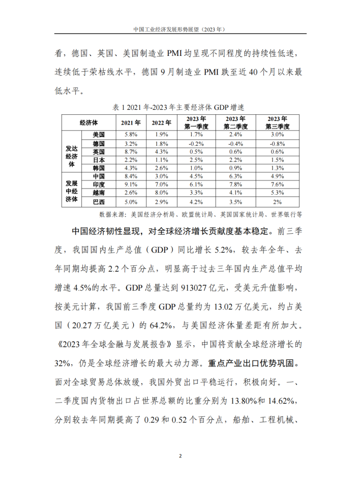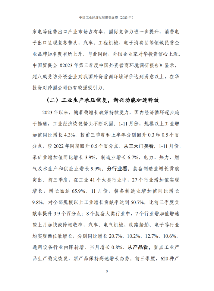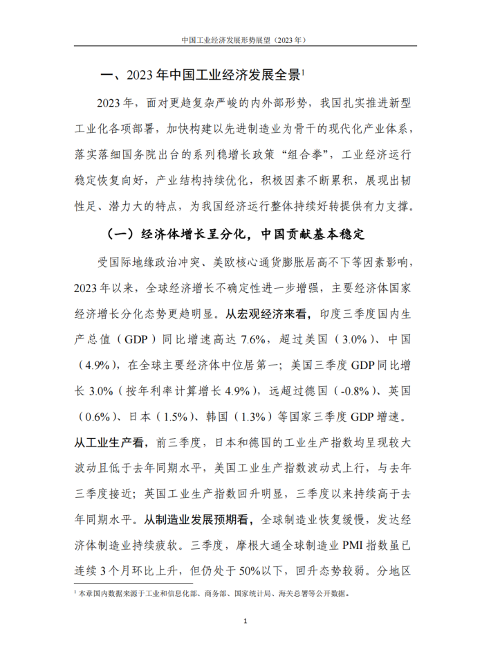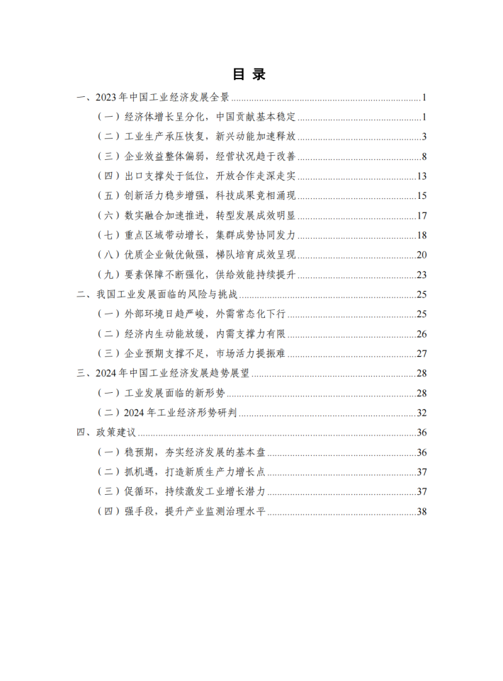 2023年是全面贯彻落实党的二十大精神的开局之年,是“十四五”规划实施承前启后的关键之年。随着政策组合拳效应逐步显现,我国经济运行回升向好,发展质量稳步提升,工业经济总体保持稳定增长态势,体现出韧性足、潜力大的特点。但同时也要看到,外需常态化下行、内需支撑力有限等需求不足问题仍然突出,企业市场预期提振难度仍然较大,工业经济增长仍面临较大下行压力。