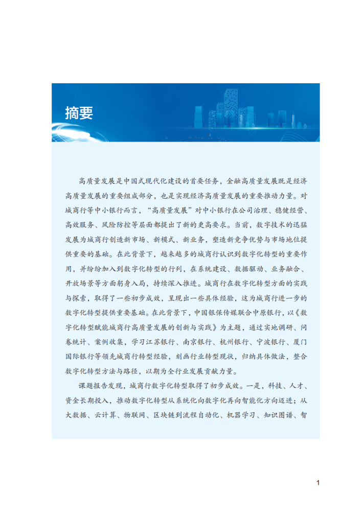 高质量发展是中国式现代化建设的首要任务,金融高质量发展既是经济高质量发展的重要组成部分,也是实现经济高质量发展的重要推动力量。对城商行等中小银行而言,“高质量发展”对中小银行在公司治理、稳健经营、高效服务、风险防控等层面都提出了新的更高要求。当前,数字技术的迅猛发展为城商行创造新市场、新模式、新业务,塑造新竞争优势与市场地位提供重要的基础。在此背景下,越来越多的城商行认识到数字化转型的重要作用,并纷纷加入到数字化转型的行列,在系统建设、数据驱动、业务融合、开放场景等方面躬身入局,持续深入推进。城商行在数字化转型方面的实践与探索,取得了一些初步成效,呈现出一些具体经验,这为城商行进一步的数字化转型提供重要基础。在此背景下,中国银保传媒联合中原银行,以《数字化转型赋能城商行高质量发展的创新与实践》为主题,通过实地调研、问卷统计、案例收集,学习江苏银行、南京银行、杭州银行、宁波银行、厦门国际银行等领先城商行转型经验,刻画行业转型现状,归纳具体做法,整合数字化转型方法与路径,以期为全行业发展贡献力量。