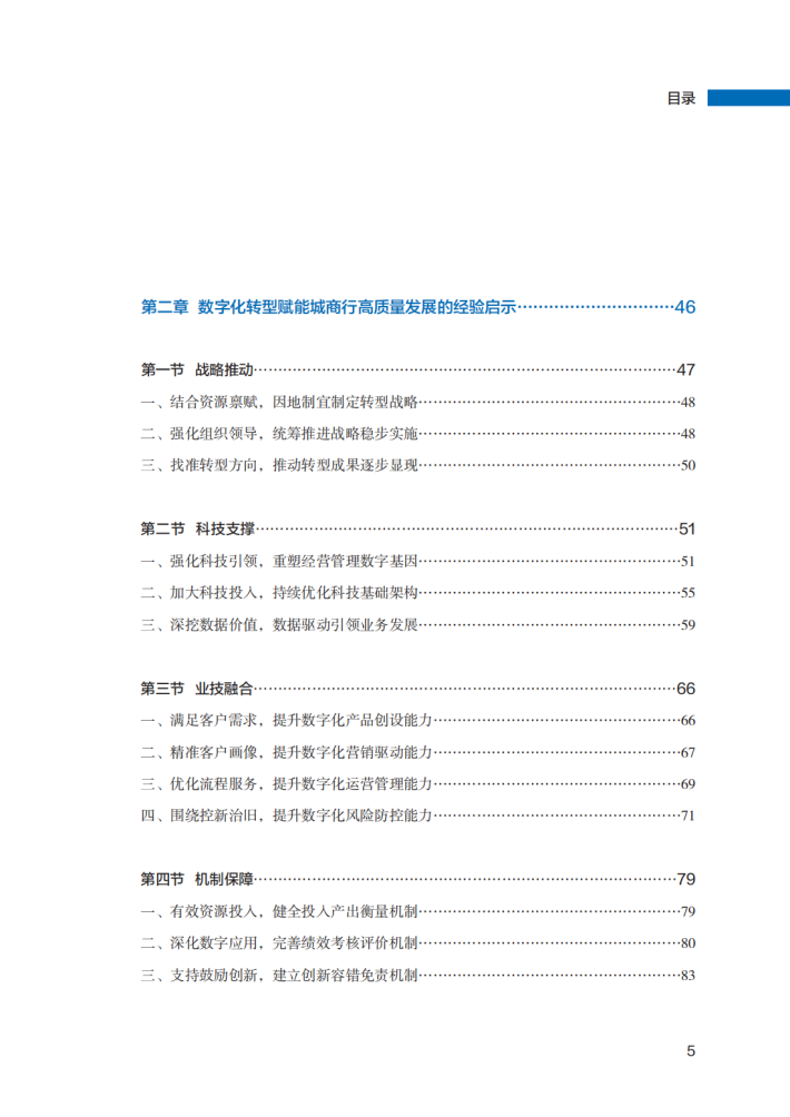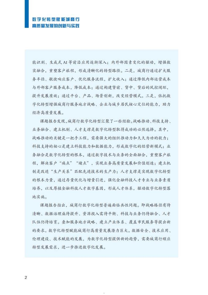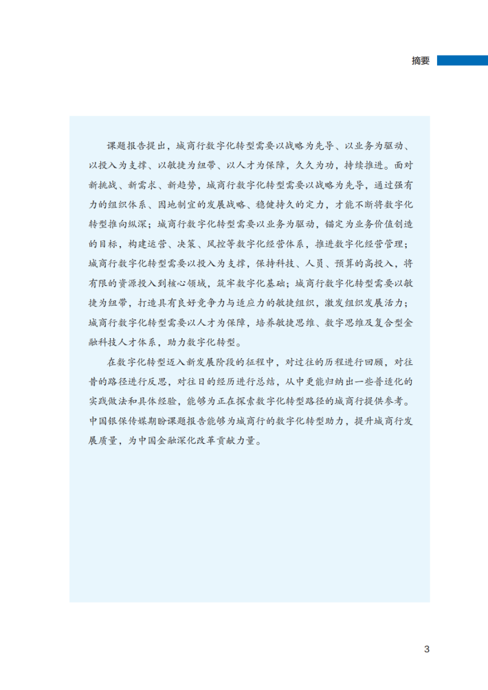 课题报告发现,城商行数字化转型汇聚了一些经验。战略推动、科技支持、业务融合、建立机制、人才支撑是数字化转型取得成功的必然选择。其中,战略推动的关键是一把手工程,需要强大的组织推动力和久久为功的毅力;科技支持的核心是建立科技能力和数据能力,形成数字化的经营新模式;业务融合是数字化转型的根本,通过数字技术与业务的全面融合,重塑客户旅程,解决客户“痛点”“堵点”,实现业务高质量发展和价值创造;建立机制是改进“生产关系”匹配先进技术的生产力;人才支撑是实现数字化转型的根本力量,通过存量优化与增量引进,强化金融科技人才专业与业务素质培养,以及厚植金融科技人才数字基因,形成人才体系,驱动数字化转型落地实施。