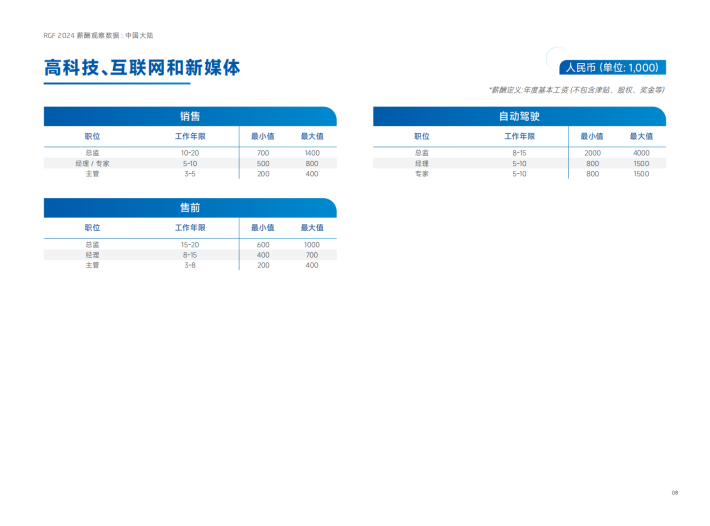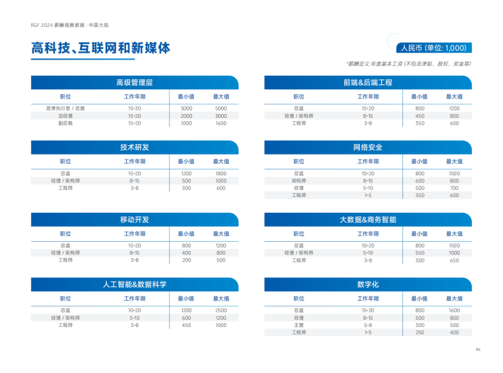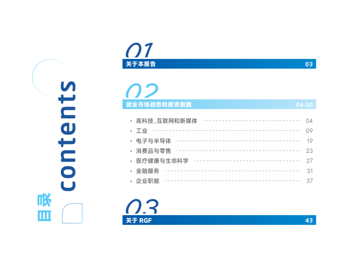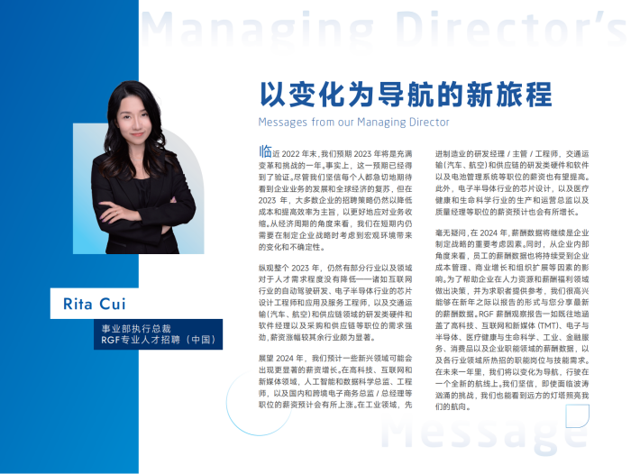 毫无疑问,在2024年,薪酬数据将继续是企业制定战略的重要考虑因素。同时,从企业内部角度来看,员工的薪酬数据也将持续受到企业成本管理、商业增长和组织扩展等因素的影响。为了帮助企业在人力资源和薪酬福利领域做出决策,并为求职者提供参考,我们很高兴能够在新年之际以报告的形式与您分享最新的薪酬数据。RGF薪酬观察报告一如既往地涵盖了高科技、互联网和新媒体(TMT)、电子与半导体、医疗健康与生命科学、工业、金融服务、消费品以及企业职能领域的薪酬数据,以及各行业领域所热招的职能岗位与技能需求。在未来一年里,我们将以变化为导航,行驶在一个全新的航线上。我们坚信,即使面临波涛汹涌的挑战,我们也能看到远方的灯塔照亮我