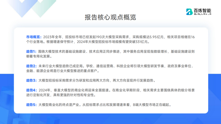 市场概览:2023年全年,招投标市场已经发起190次大模型采购需求,采购规模达5.95亿元,相关项目相继在16个行业落地。根据增速保守预计,2024年大模型招投标市场规模有望突破331亿元。