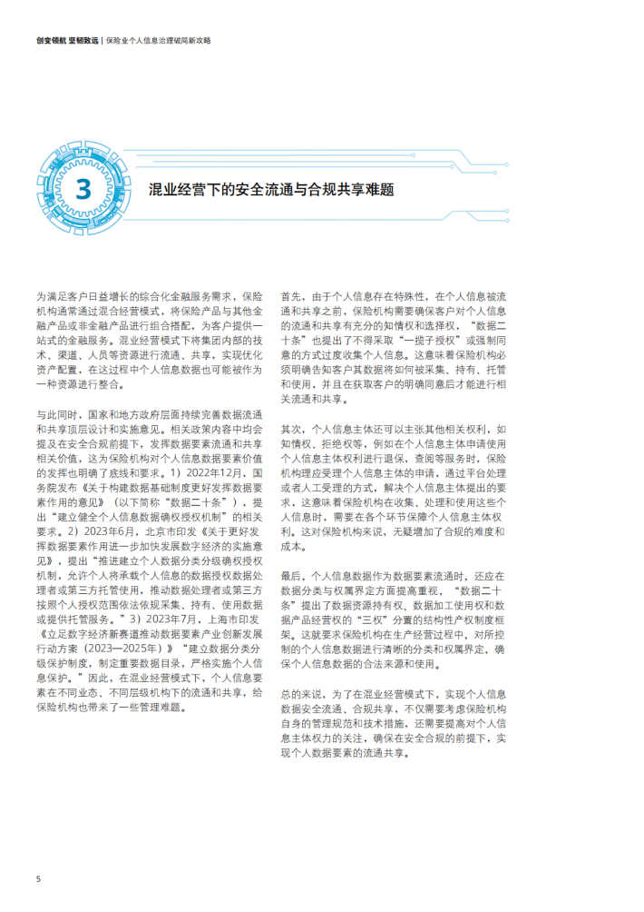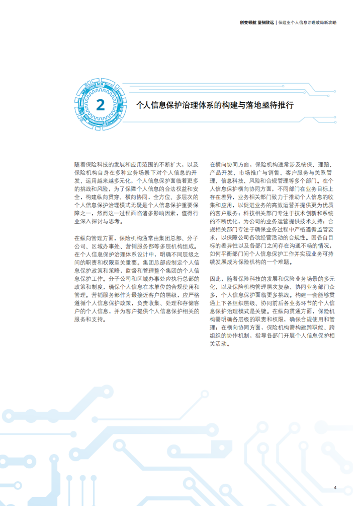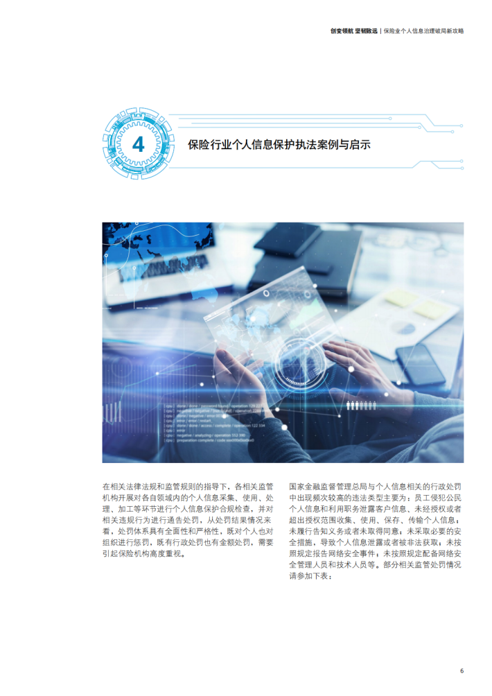 本报告旨在探讨保险行业个人信息保护所面临的难点与挑战,并提出相应的应对策略和思考。首先,报告从监管要求、治理体系、合规共享等方面对个人信息保护形势进行梳理,剖析保险行业中存在的难点与挑战。其次,报告结合业内实践和先进经验,提出在相关领域的思考,并给出应对策略和推进方法。