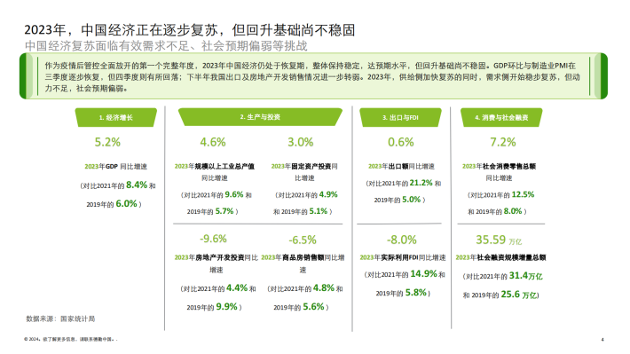 作为疫情后管控全面放开的第一个完整年度,2023年中国经济仍处于恢复期,整体保持稳定,达预期水平,但回升基础尚不稳固。GDP环比与制造业PMI在三季度逐步恢复,但四季度则有所回落;下半年我国出口及房地产开发销售情况进一步转弱。2023年,供给侧加快复苏的同时,需求侧开始稳步复苏,但动力不足,社会预期偏弱。