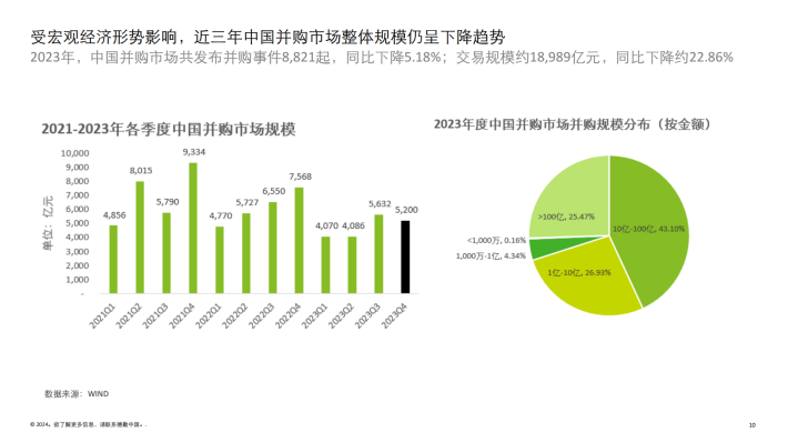 2023年,中国并购市场共发布并购事件8,821起,同比下降5.18%;交易规模约18,989亿元,同比下降约22.86%