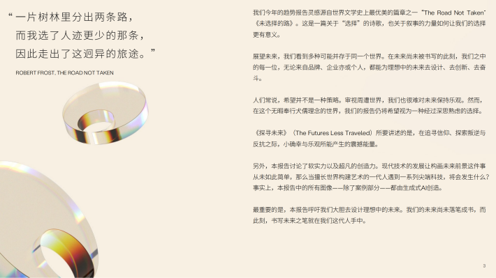 我们今年的趋势报告灵感源自世界文学史上最优美的篇章之一“The Road Not Taken”《未选择的路》。这是一篇关于“选择”的诗歌,也关于叙事的力量如何让我们的选择更有意义。