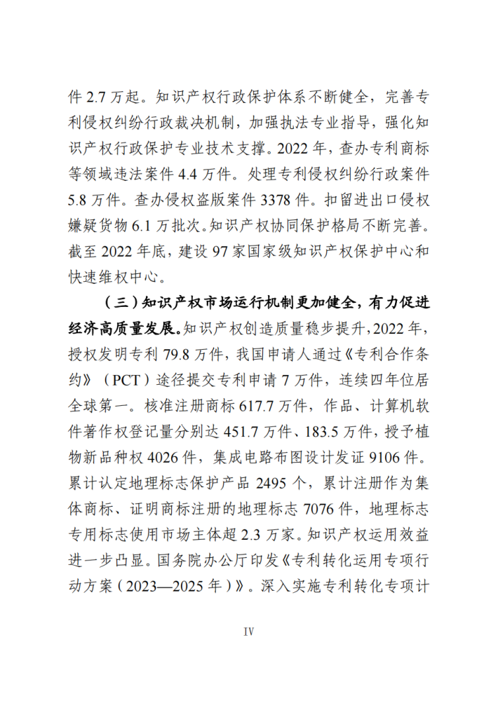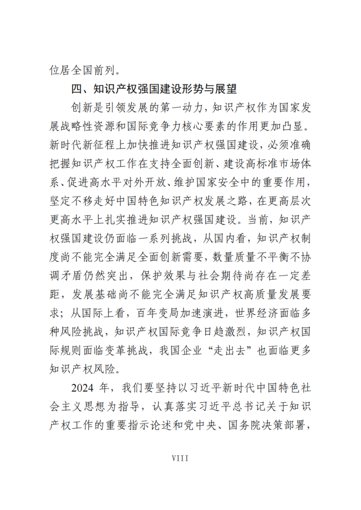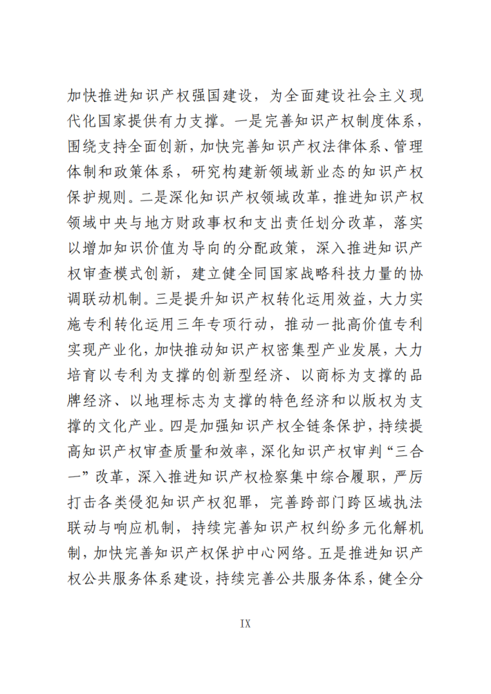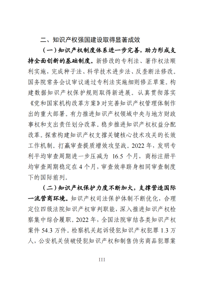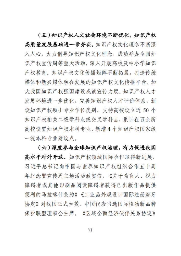 知识产权制度进一步完善,保护力度不断加大,创造质量持续提升,运用效益日益凸显,公共服务便利化水平明显提高,人文社会环境进一步优化,国际合作和