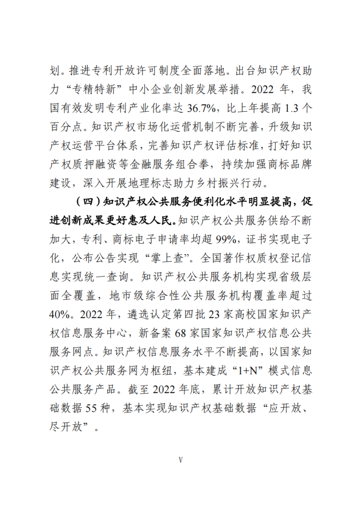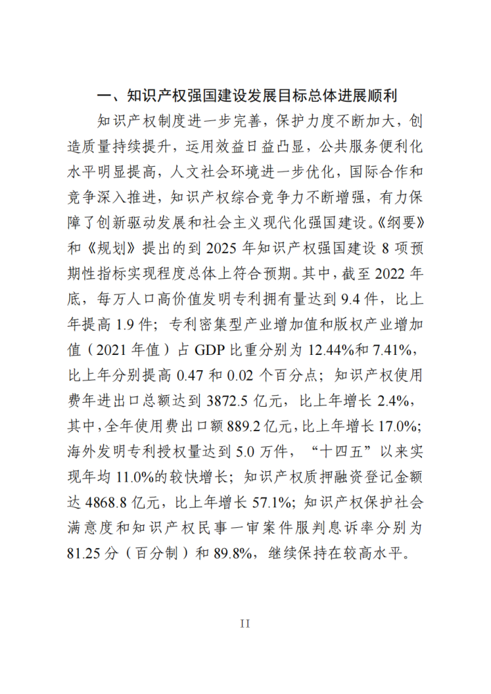 竞争深入推进,知识产权综合竞争力不断增强,有力保障了创新驱动发展和社会主义现代化强国建设。《纲要》和《规划》提出的到2025年知识产权强国建设8项预期性指标实现程度总体上符合预期。其中,截至2022年底,每万人口高价值发明专利拥有量达到9.4件,比上年提高1.9件;专利密集型产业增加值和版权产业增加值(2021年值)占GDP比重分别为12.44%和7.41%,比上年分别提高0.47和0.02个百分点;知识产权使用费年进出口总额达到3872.5亿元,比上年增长2.4%,其中,全年使用费出口额889.2亿元,比上年增长17.0%;海外发明专利授权量达到5.0万件, “十四五”以来实现年均11.0%的较快增长;知识产权质押融资登记金额达4868.8亿元,比上年增长57.1%;知识产权保护社会满意度和知识产权民事一审案件服判息诉率分别为81.25分(百分制)和89.8%,继续保持在较高水平。