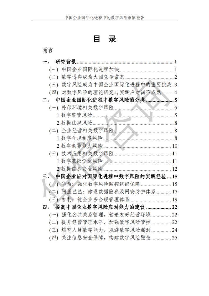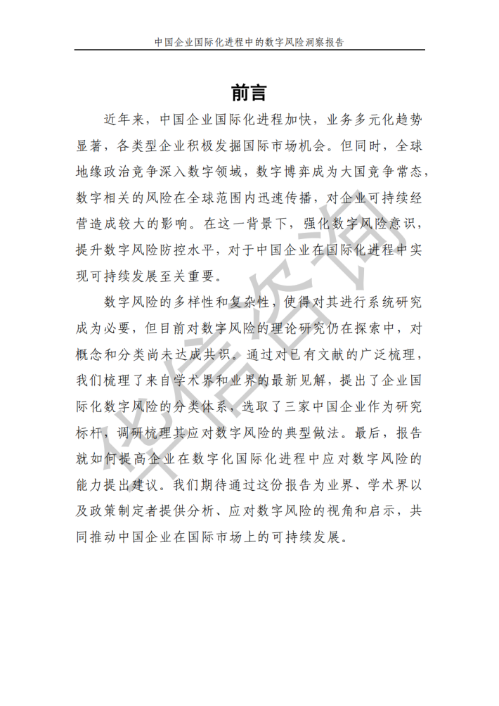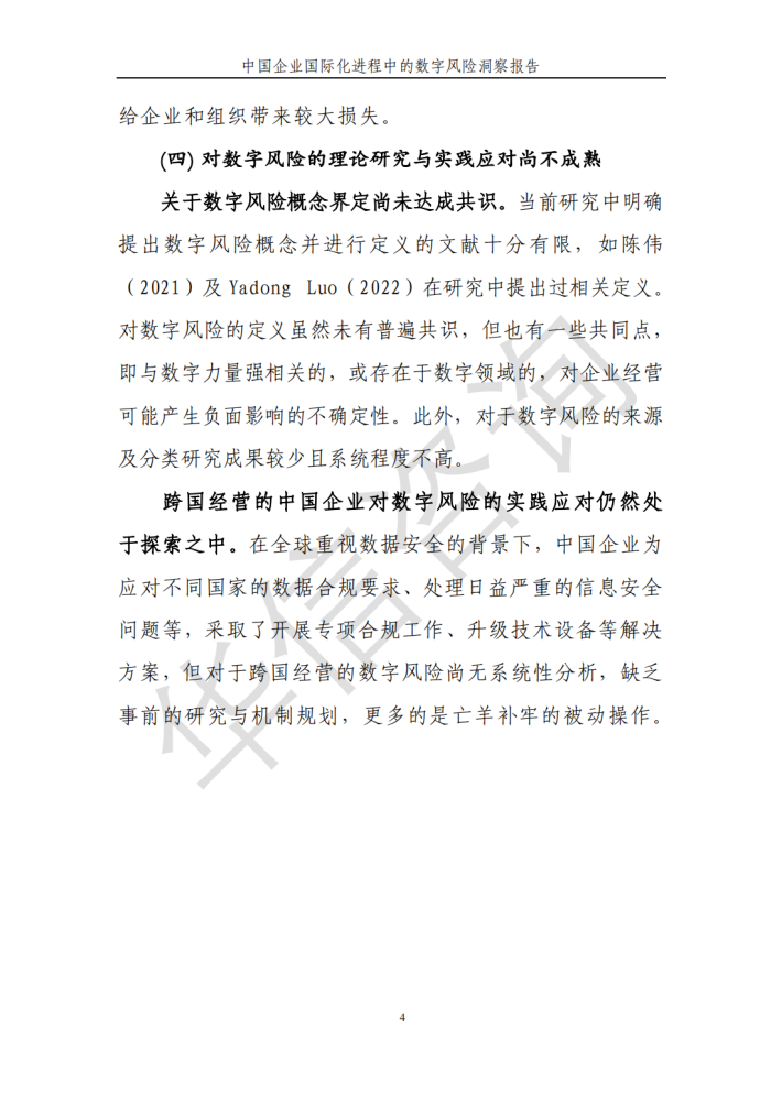 数字风险的多样性和复杂性,使得对其进行系统研究成为必要,但目前对数字风险的理论研究仍在探索中,对概念和分类尚未达成共识。通过对已有文献的广泛梳理,我们梳理了来自学术界和业界的最新见解,提出了企业国际化数字风险的分类体系,选取了三家中国企业作为研究标杆,调研梳理其应对数字风险的典型做法。最后,报告就如何提高企业在数字化国际化进程中应对数字风险的能力提出建议。我们期待通过这份报告为业界、学术界以及政策制定者提供分析、应对数字风险的视角和启示,共同推动中国企业在国际市场上的可持续发展。
