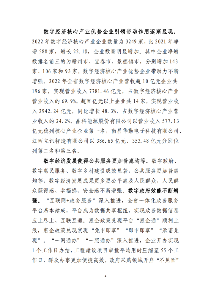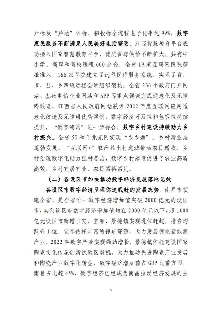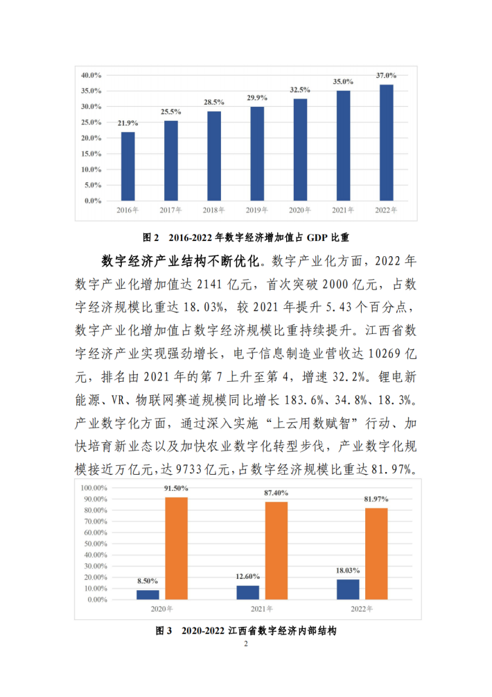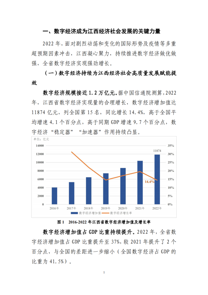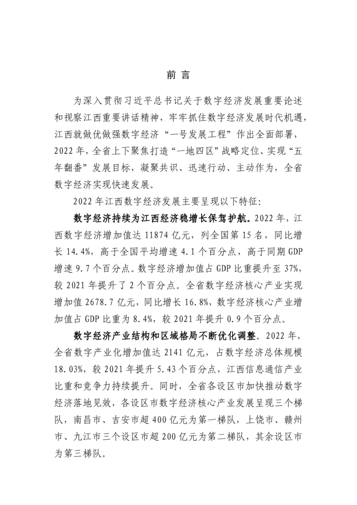 数字经济持续为江西经济稳增长保驾护航。2022年,江西数字经济增加值达11874亿元,列全国第15名,同比增长14.4%,高于全国平均增速4.1个百分点,高于同期GDP增速9.7个百分点。数字经济增加值占GDP比重提升至37%,较2021年提升了2个百分点。全省数字经济核心产业实现增加值2678.7亿元,同比增长16.8%,数字经济核心产业增加值占GDP比重为8.4%,较2021年提升0.9个百分点。