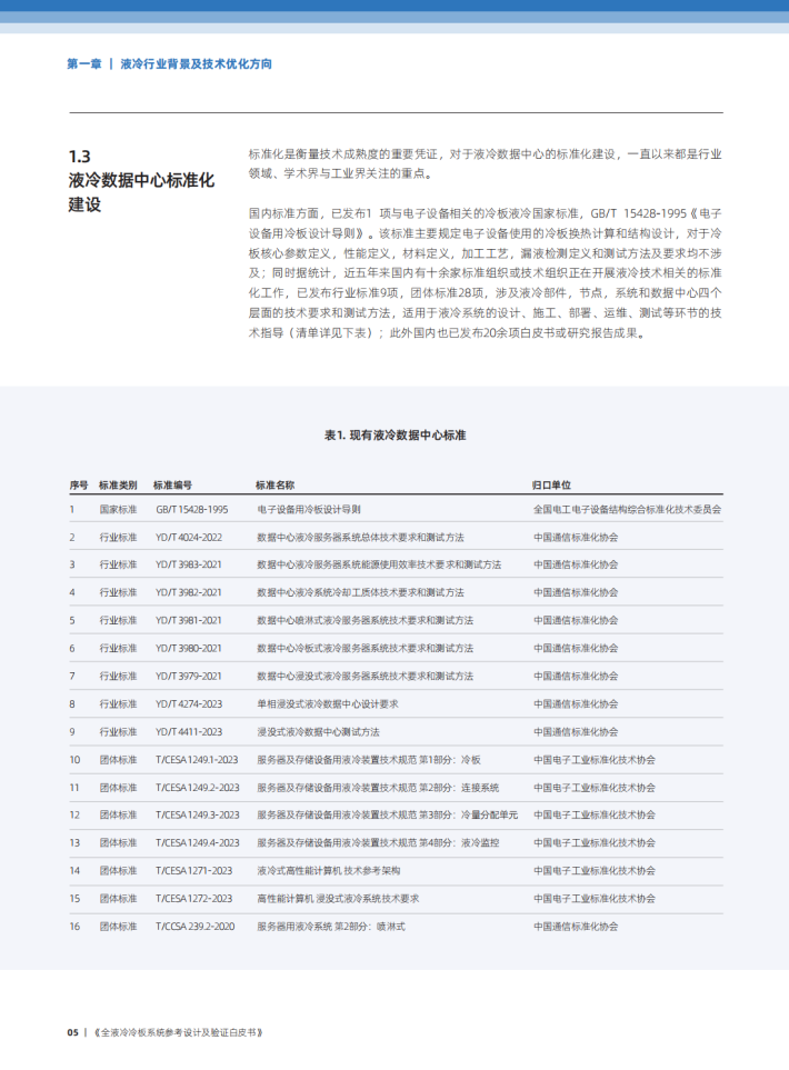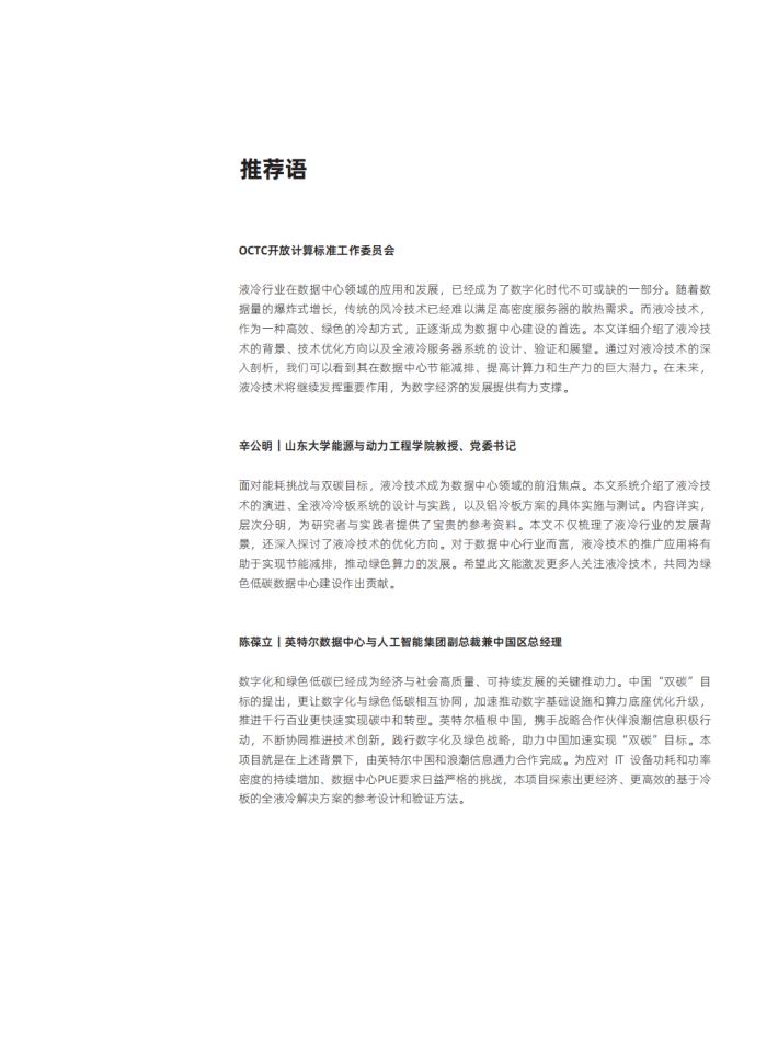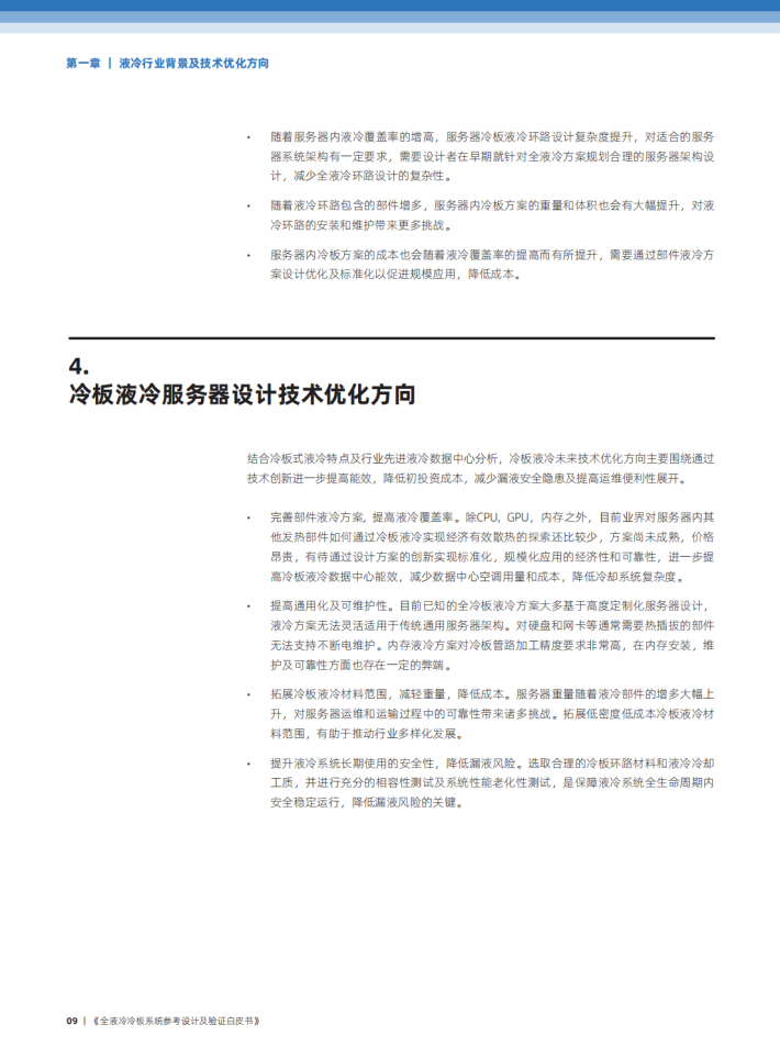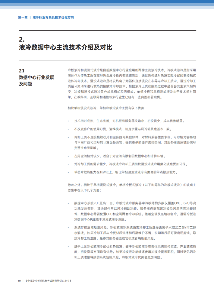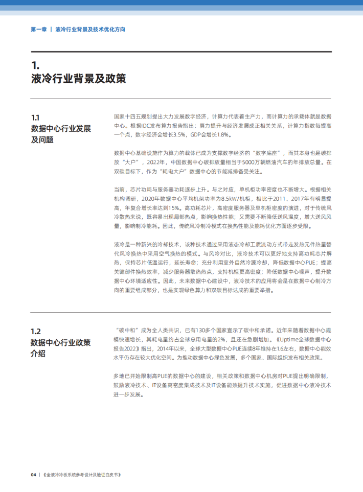 液冷是一种新兴的冷却技术,该种技术通过采用液态冷却工质流动方式带走发热元件热量替代风冷换热中采用空气换热的模式。与风冷对比,液冷技术可以更好她支持高功耗林片解热,保持热片低温运行,延长寿命;充分利用室外自然冷源冷却,降低数据中心PUE;提高关箍部件换热效率,减少服务器散热热点,支持机柜更高密度;降低数据中心喉声,提升数据中心环境适应性。因此,未来数据中心建设中,液冷技术的应用将会是在教据中心制冷方向的重要组成部分,也是实现象色算力和效碳日标达成的重要举措。