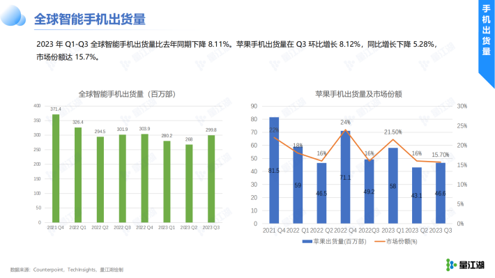 2023年Q1-Q3全球智能手机出货量比去年同期下降8.11%。苹果手机出货量在Q3环比增长8.12%,同比增长下降5.28%,市场份额达15.7%。