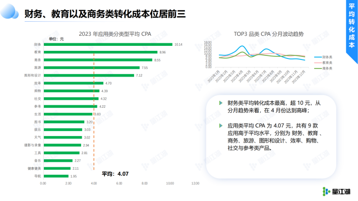应用类平均CPA为4.07元,共有9款应用高于平均水平,分别为财务、教育、商务、旅游、图形和设计、效率、购物、社交与参考类产品。