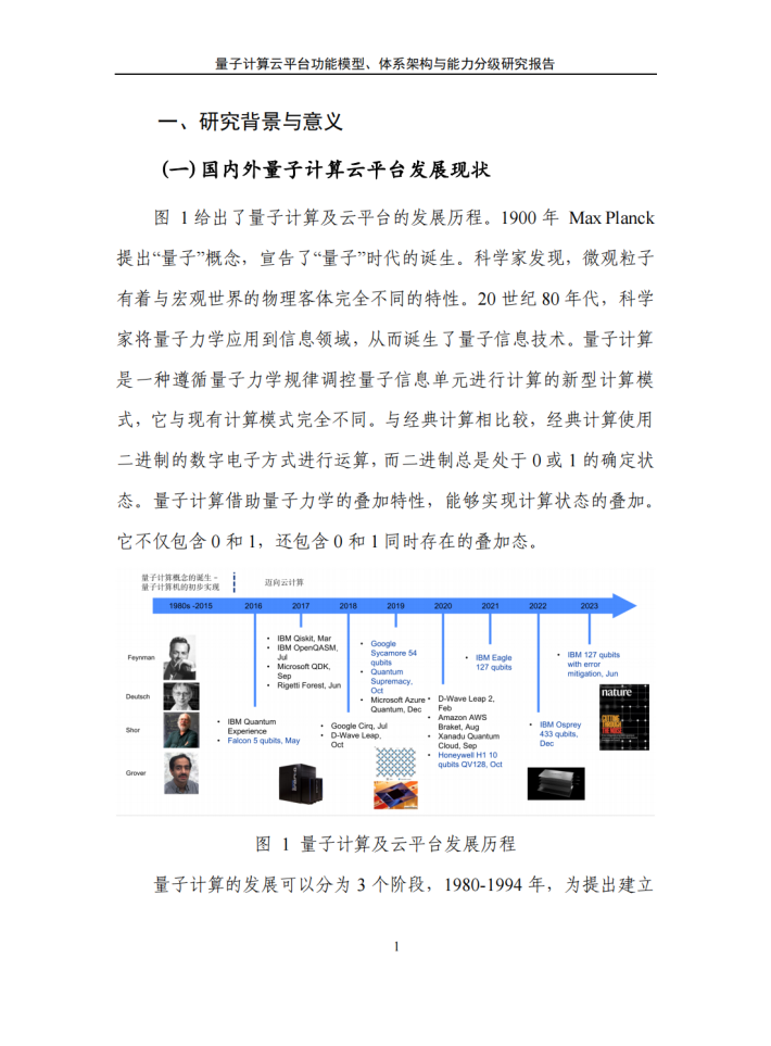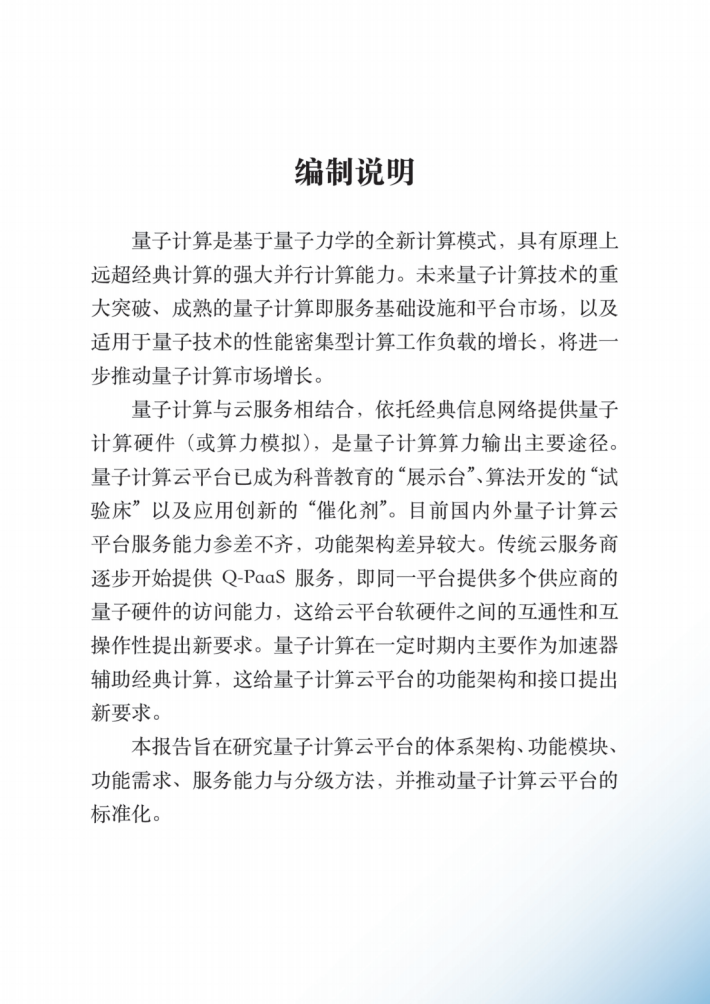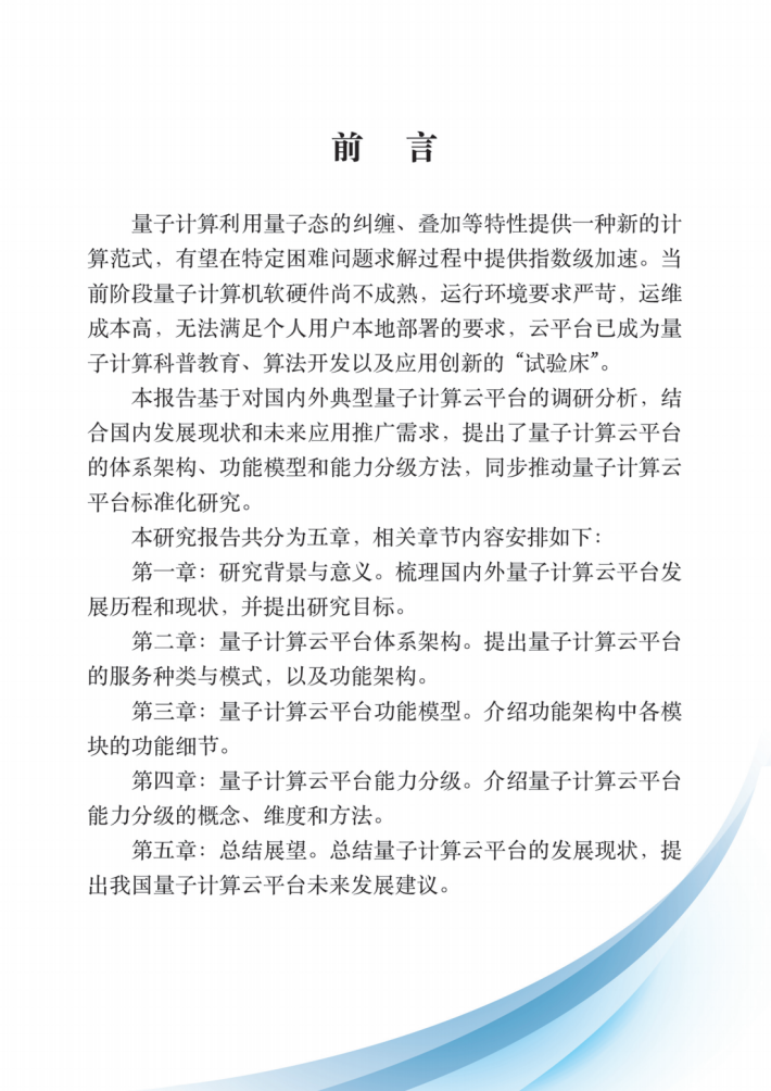 本报告旨在研究量子计算云平台的体系架构、功能模块、功能需求、服务能力与分级方法,并推动量子计算云平台的标准化。