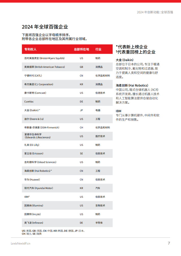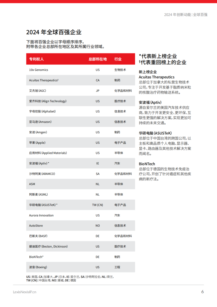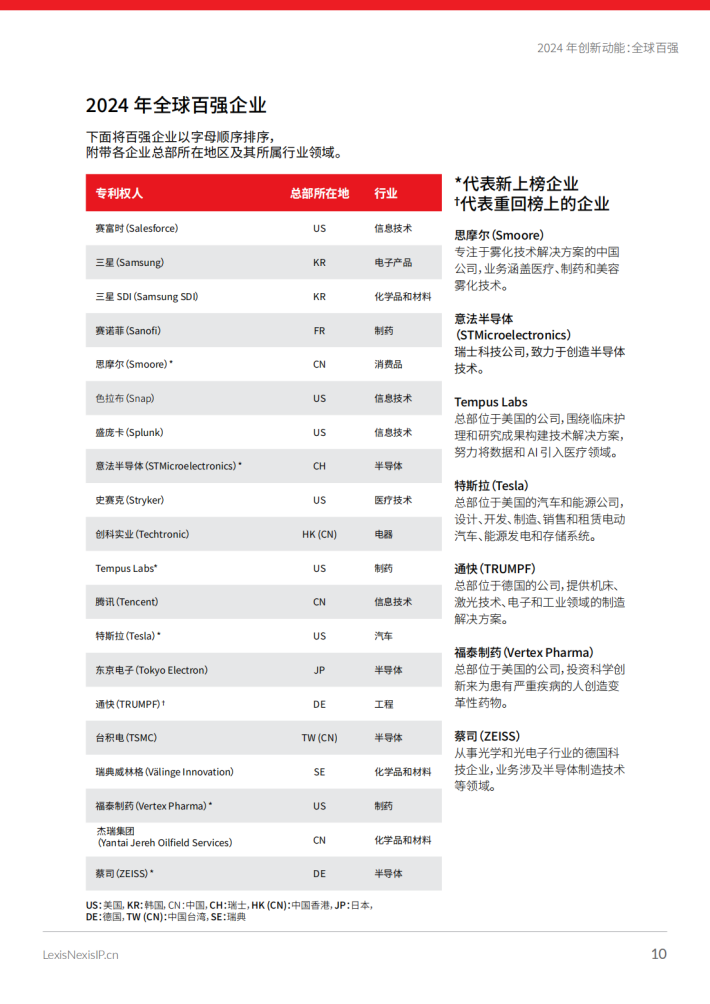 对百强榜的分析揭示了重点企业的一系列引人注目的趋势和合作,让我们了解到推动各行业前进的创新力量。今年的榜单重点关注处于人工智能(Al)开发前沿的公司,这也是IP界的关注焦点和讨论热点,特别是关于Al作为发明人的潜能。此外,本报告还探讨了榜上部分企业的最新并购活动的影响,揭示了相关行业的动态变化。