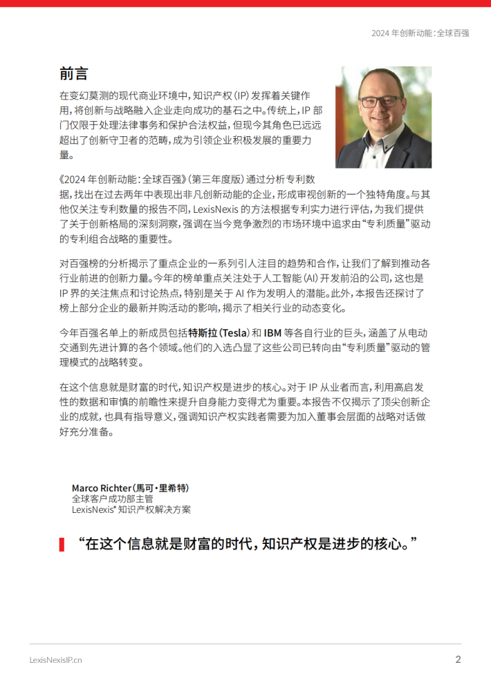在这个信息就是财富的时代,知识产权是进步的核心。对于IP从业者而言,利用高启发性的数据和审慎的前瞻性来提升自身能力变得尤为重要。本报告不仅揭示了顶尖创新企业的成就,也具有指导意义,强调知识产权实践者需要为加入董事会层面的战略对话做好充分准备。