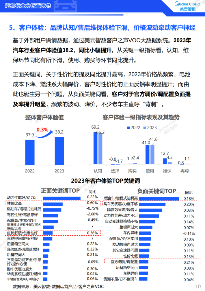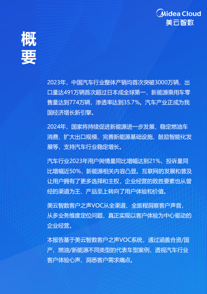 本报告基于美云智数客户之声VOC系统,通过涵盖合资/国产、燃油/新能源不同类型的代表车型案例,透视汽车行业客户体验心声、洞悉客户需求痛点。
