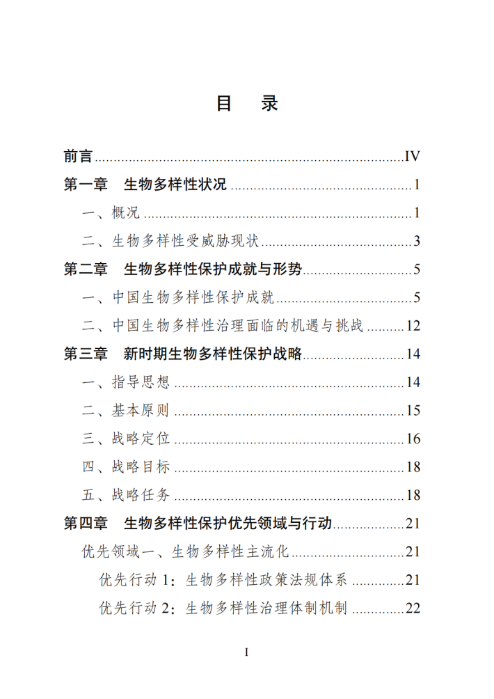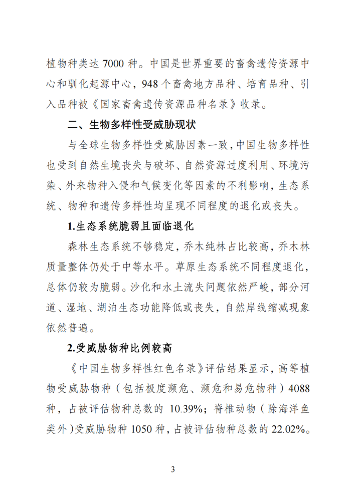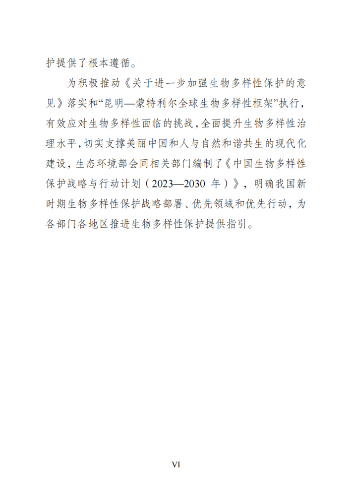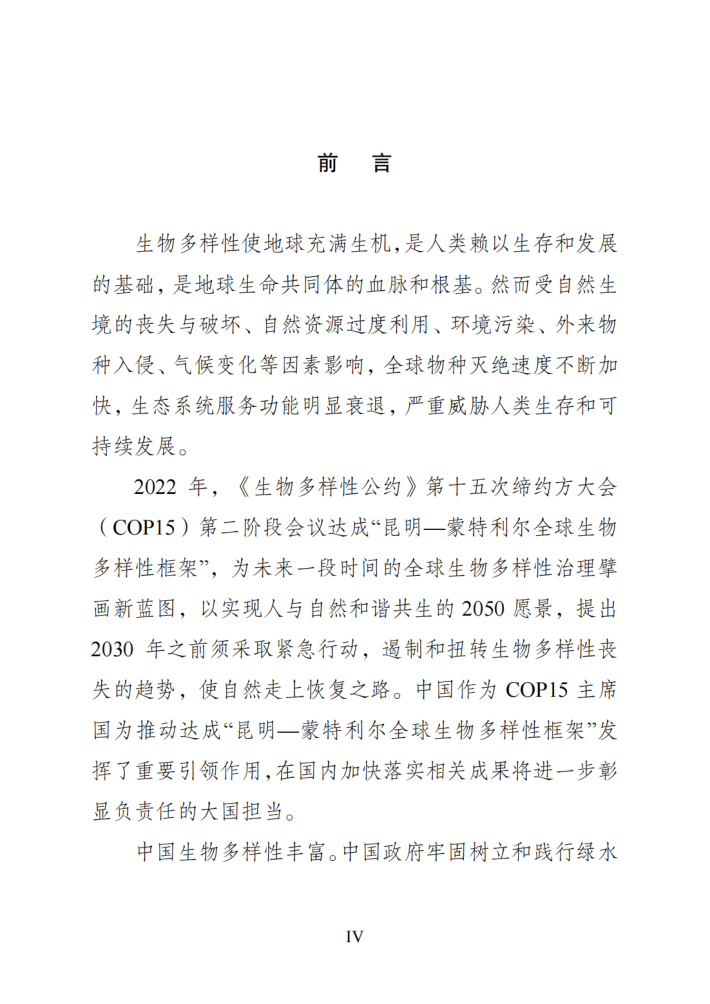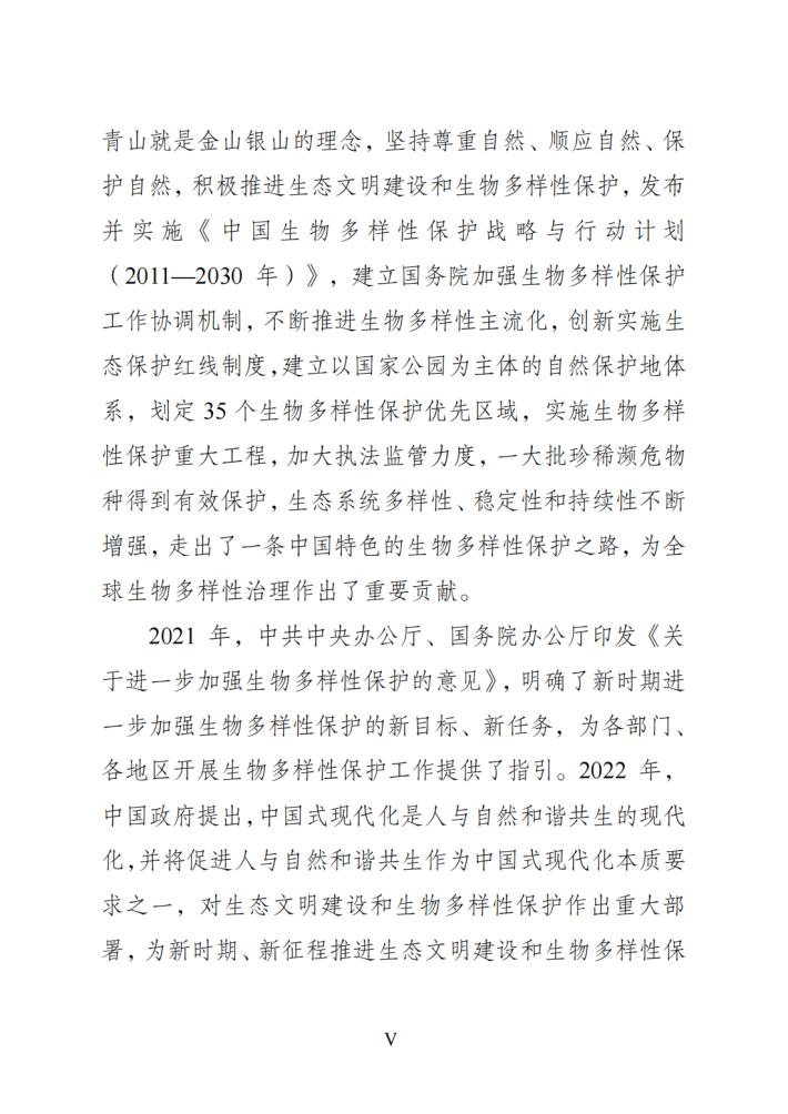 中国生物多样性丰富。中国政府牢固树立和践行绿水青山就是金山银山的理念,坚持尊重自然、顺应自然、保护自然,积极推进生态文明建设和生物多样性保护,发布并实施《中国生物多样性保护战略与行动计划(2011—2030年)》,建立国务院加强生物多样性保护工作协调机制,不断推进生物多样性主流化,创新实施生态保护红线制度,建立以国家公园为主体的自然保护地体系,划定35个生物多样性保护优先区域,实施生物多样性保护重大工程,加大执法监管力度,一大批珍稀濒危物种得到有效保护,生态系统多样性、稳定性和持续性不断增强,走出了一条中国特色的生物多样性保护之路,为全球生物多样性治理作出了重要贡献。