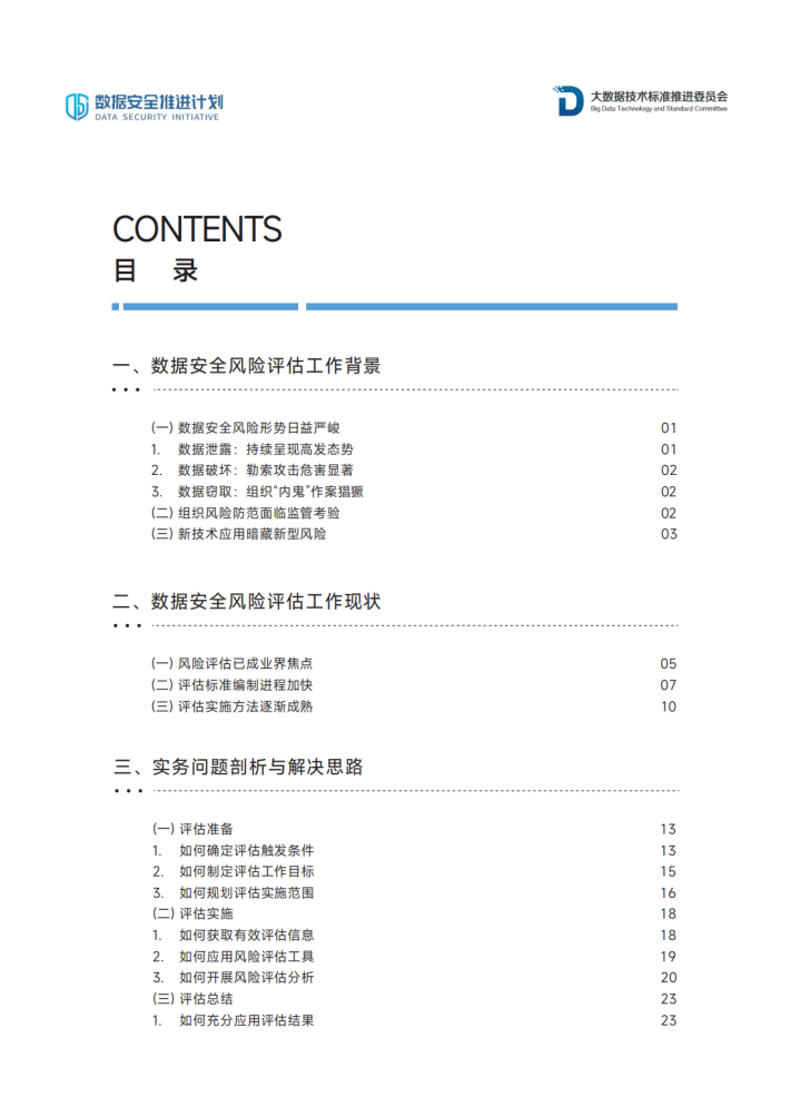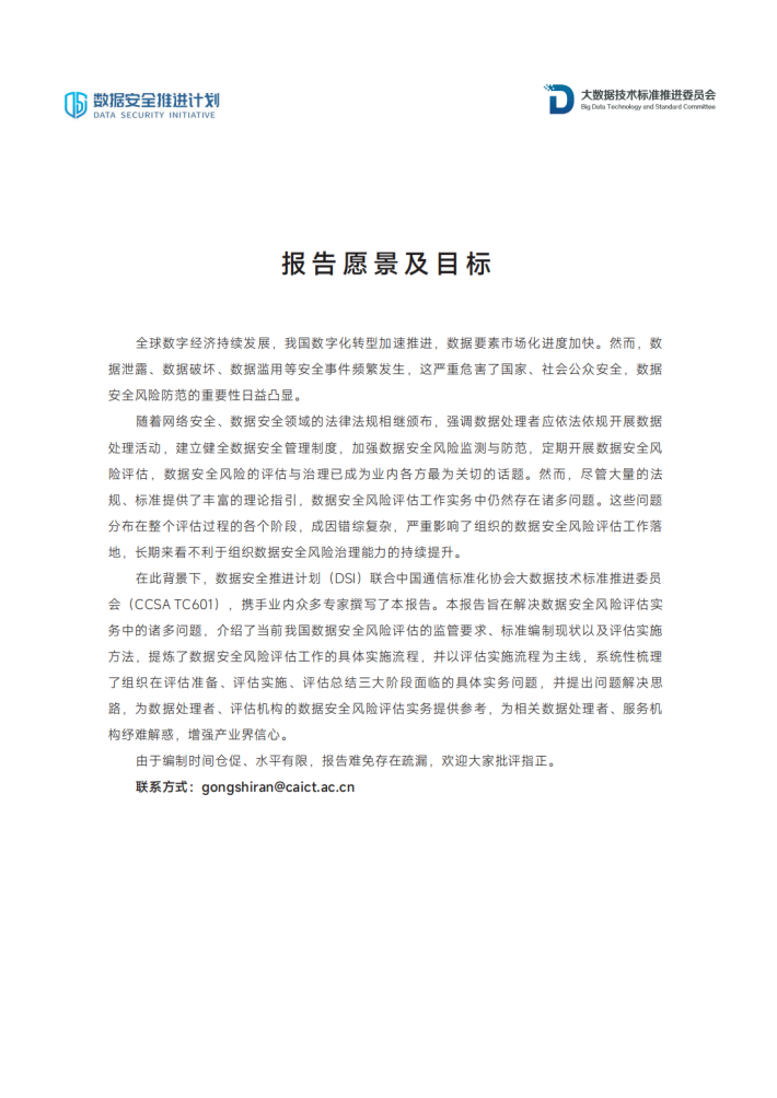在此背景下,数据安全推进计划(DSI)联合中国通信标准化协会大数据技术标准推进委员会(CCSATC601),携手业内众多专家撰写了本报告。本报告旨在解决数据安全风险评估实务中的诸多问题,介绍了当前我国数据安全风险评估的监管要求、标准编制现状以及评估实施方法,提炼了数据安全风险评估工作的具体实施流程,并以评估实施流程为主线,系统性梳理了组织在评估准备、评估实施、评估总结三大阶段面临的具体实务问题,并提出问题解决思路,为数据处理者、评估机构的数据安全风险评估实务提供参考,为相关数据处理者、服务机构纾难解惑,增强产业界信心。